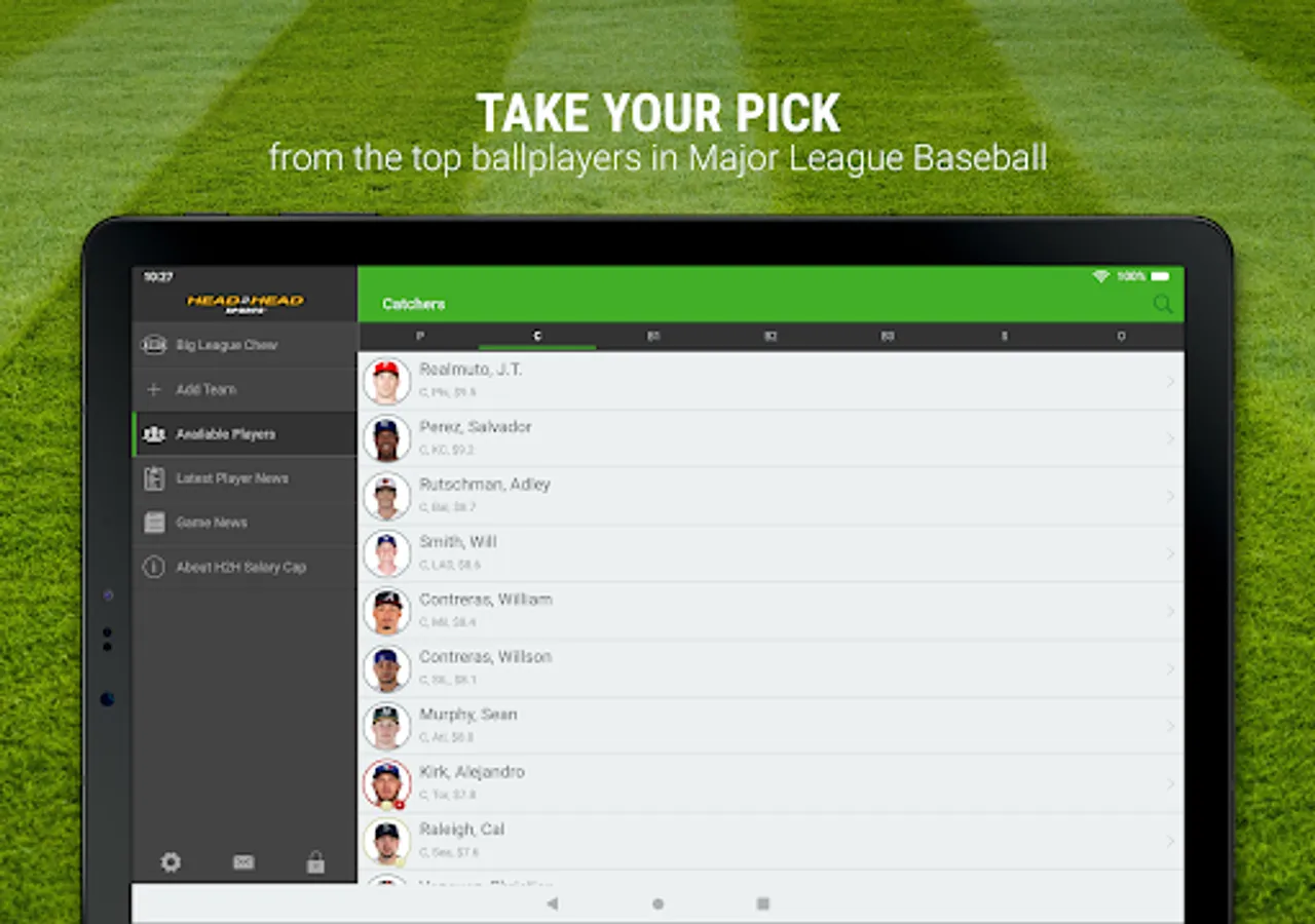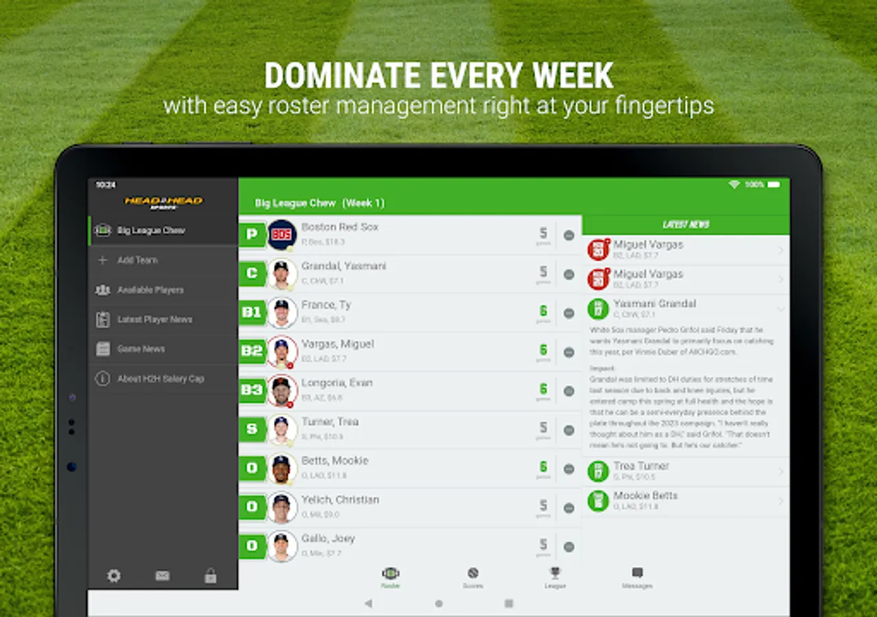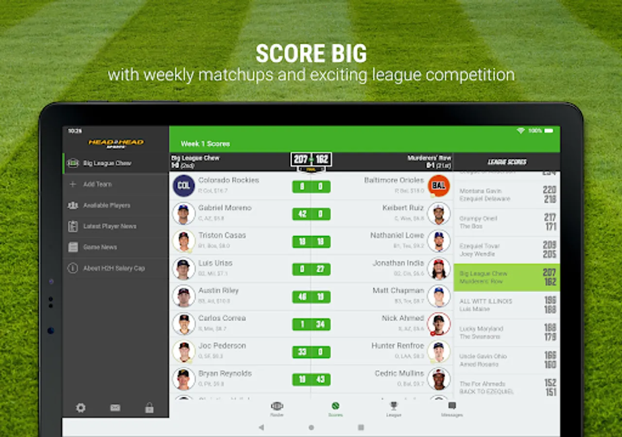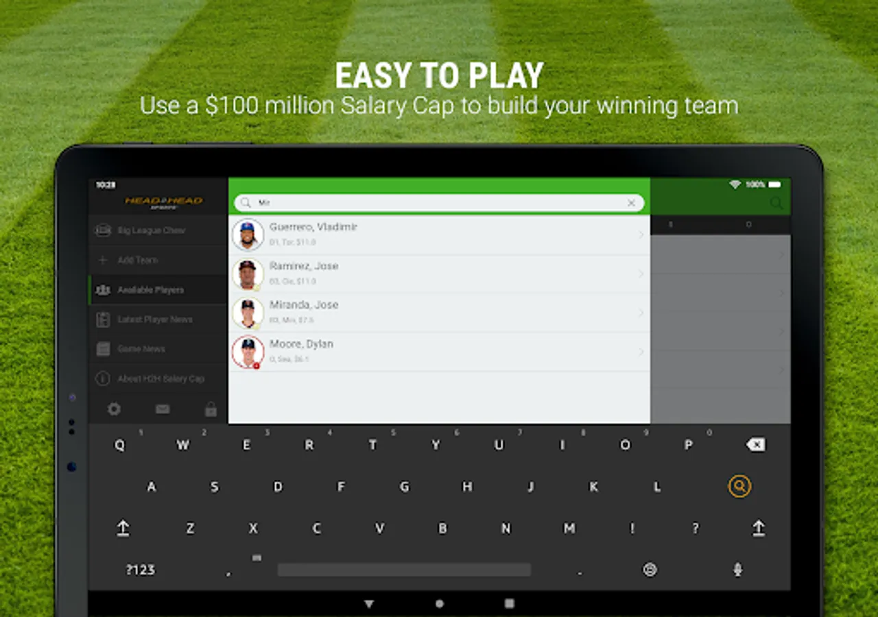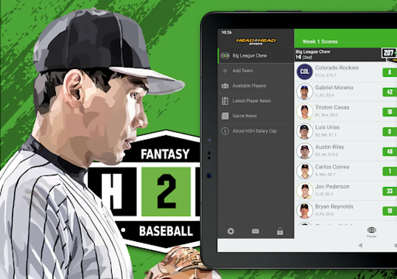Using a salary cap of $100 Million, pick a team of 8 pro baseball players, a utility player and a pitching staff that you think will score the most points each week using the unique Head-2-Head scoring system.