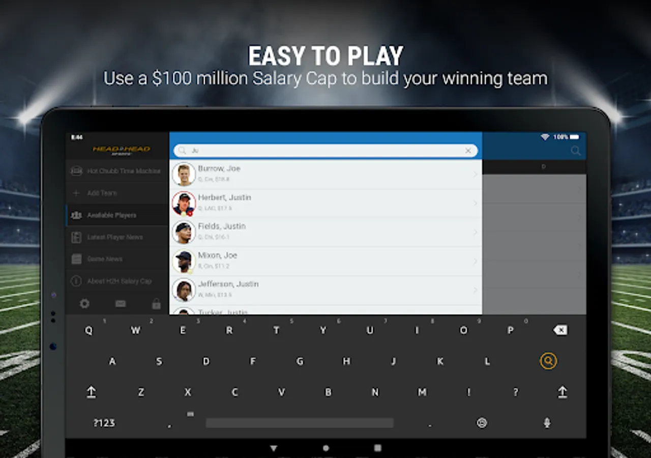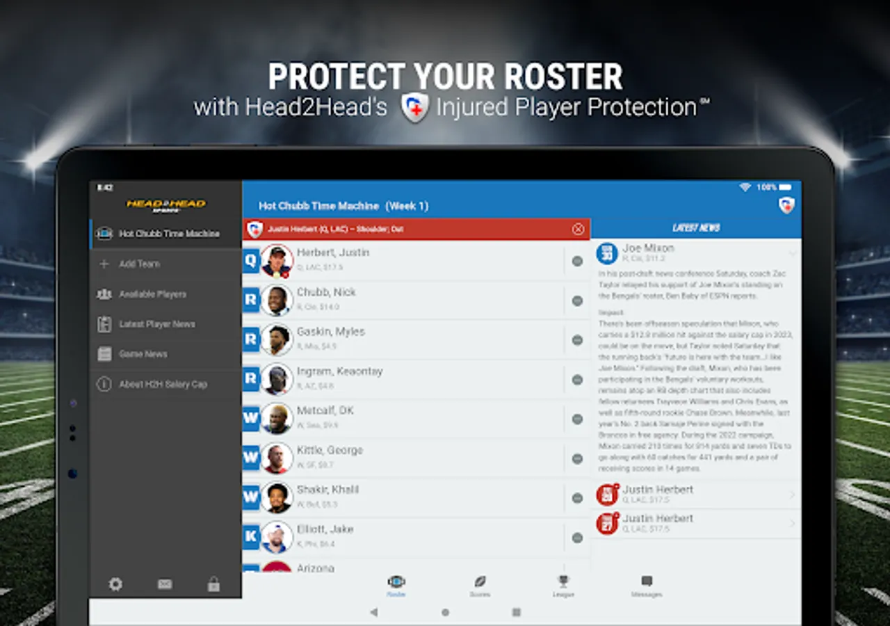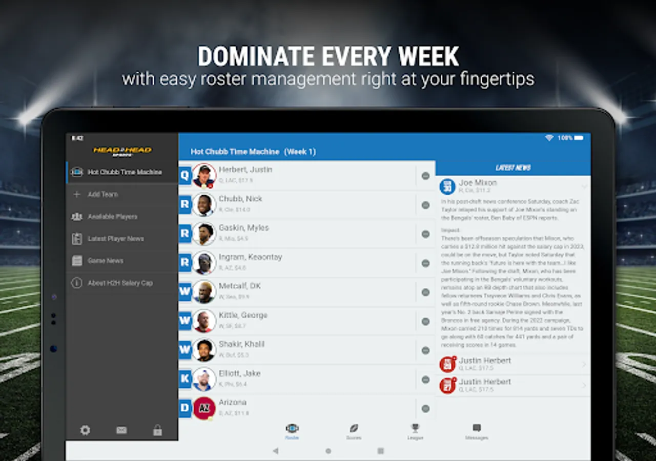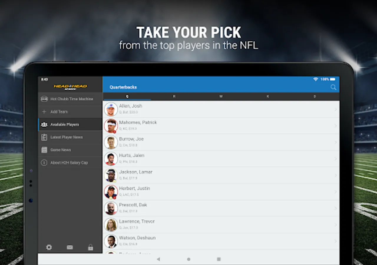 Using a salary cap of $100 Million, pick your team of 10 professional football players who you think will rack up the most points each week using our Head2Head scoring system.