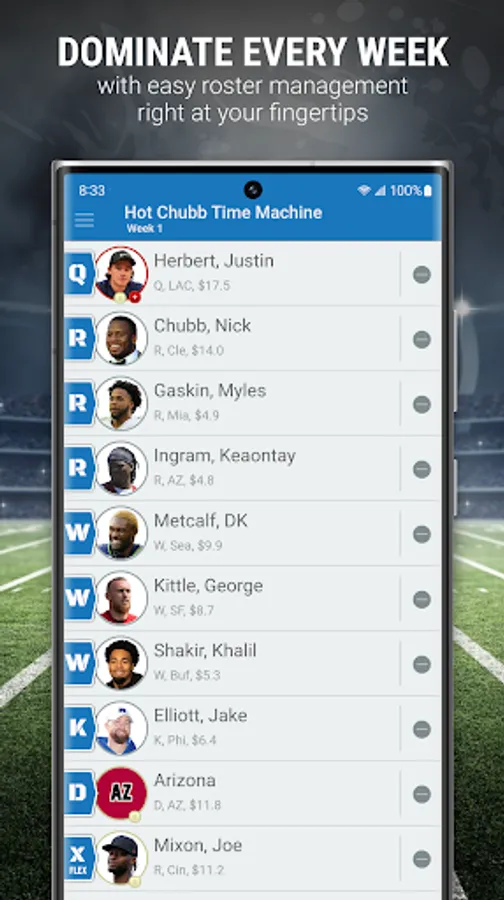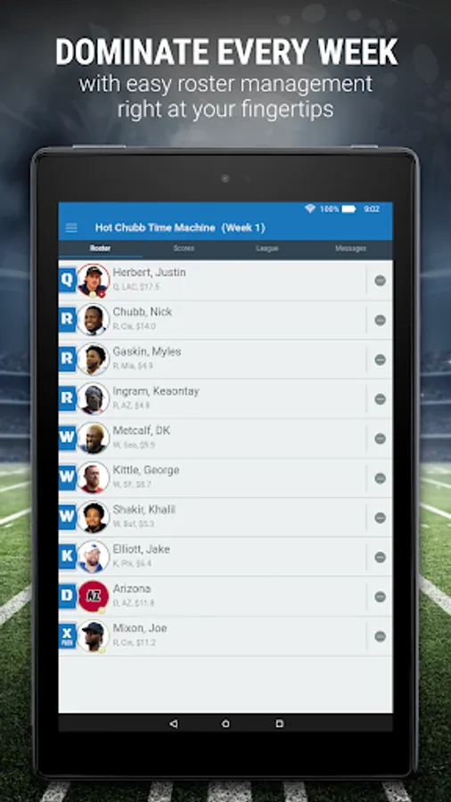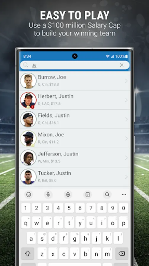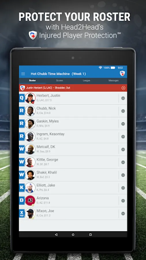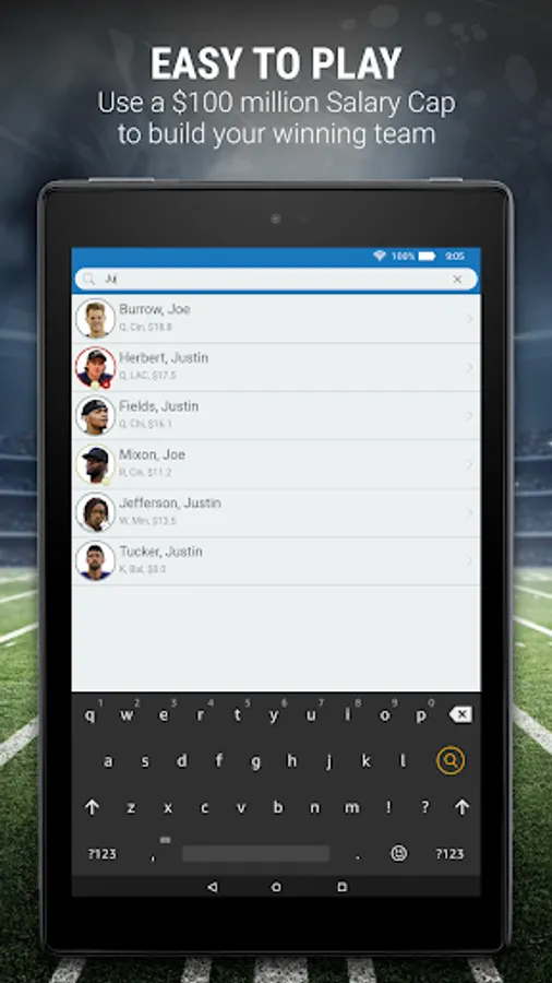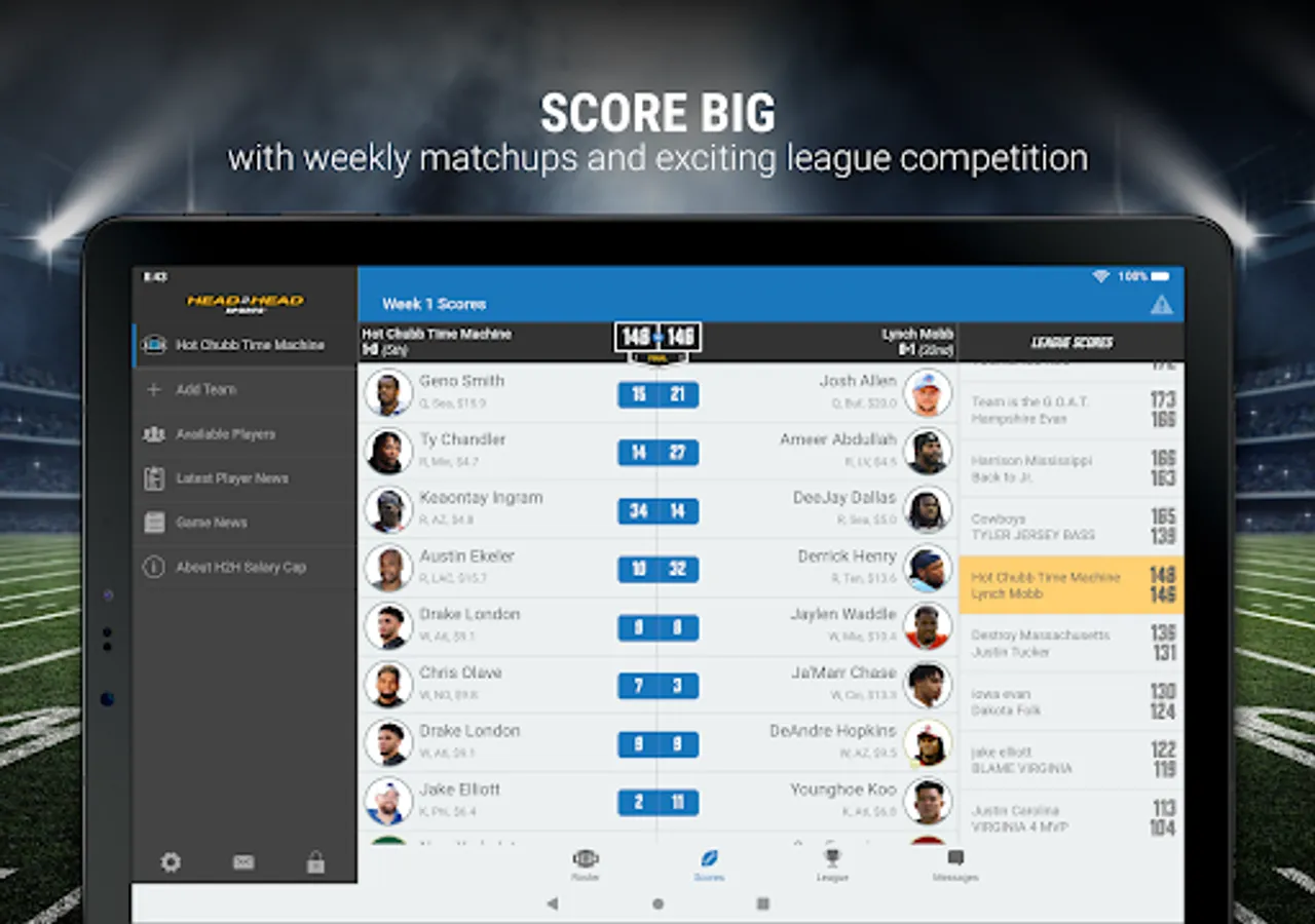 Using a salary cap of $100 Million, pick your team of 10 professional football players who you think will rack up the most points each week using our Head2Head scoring system.