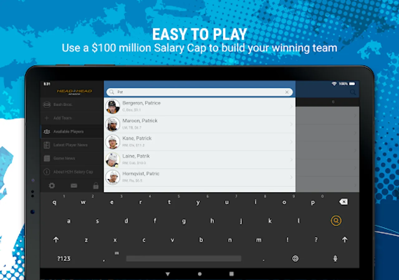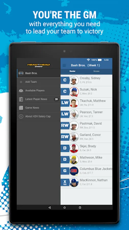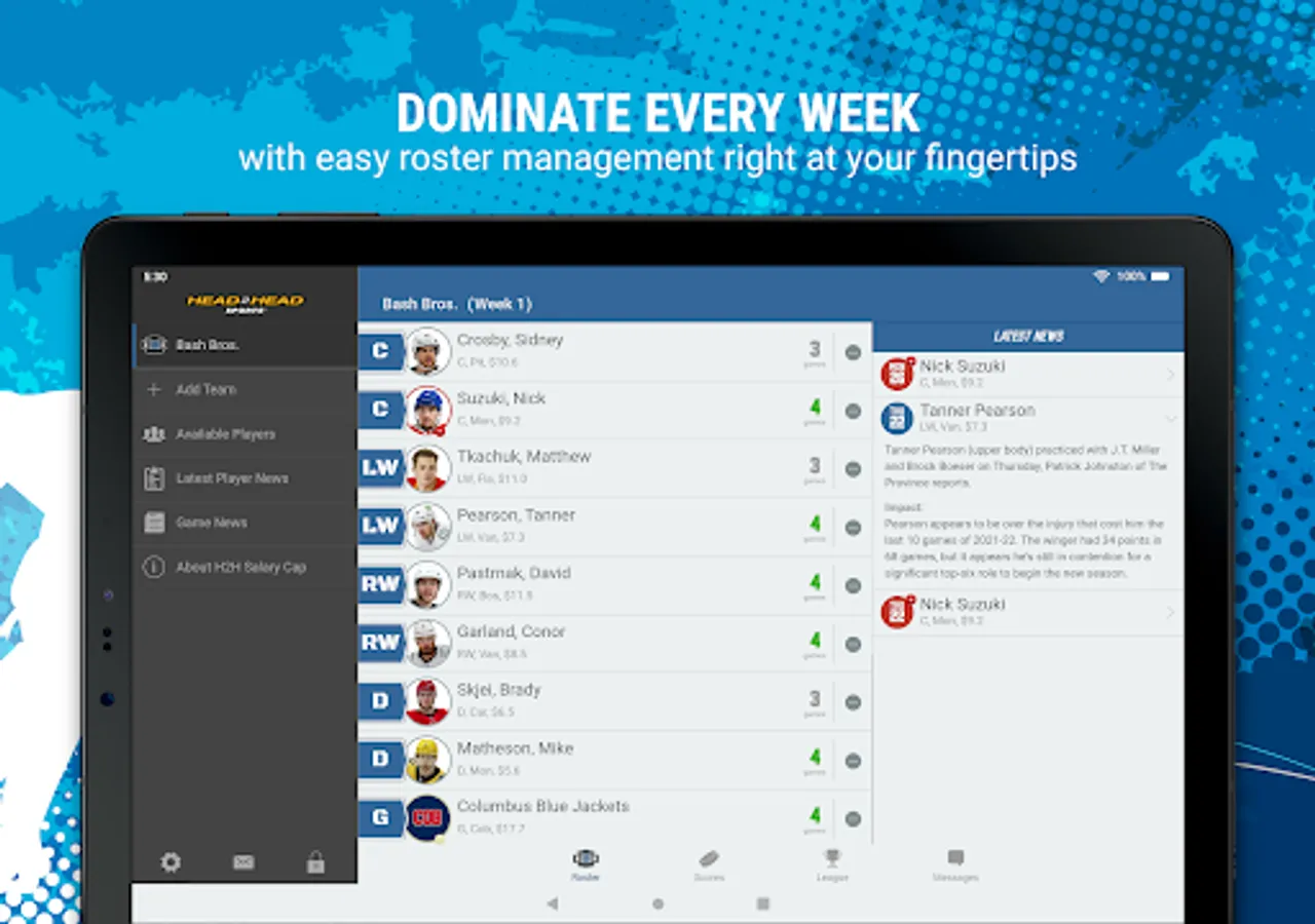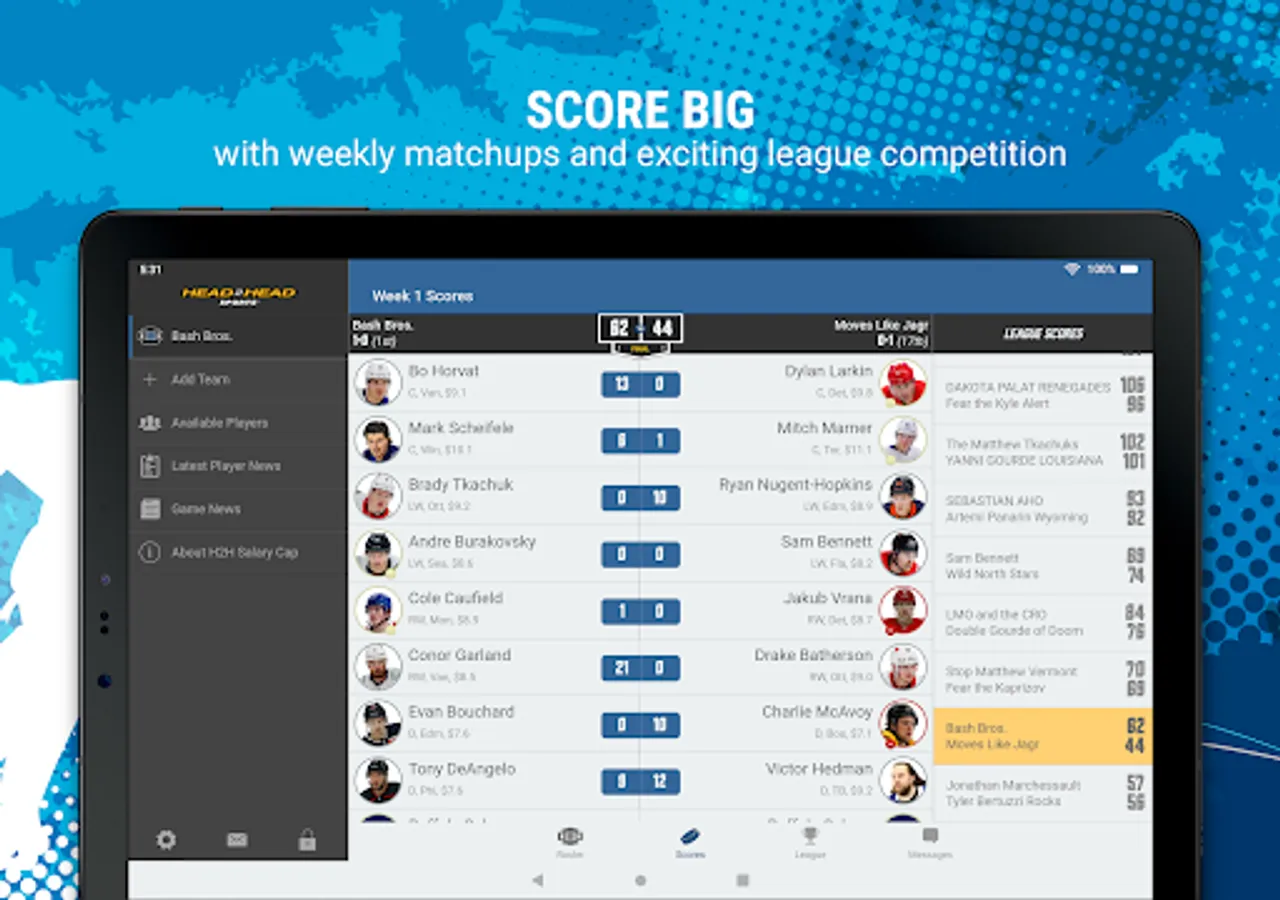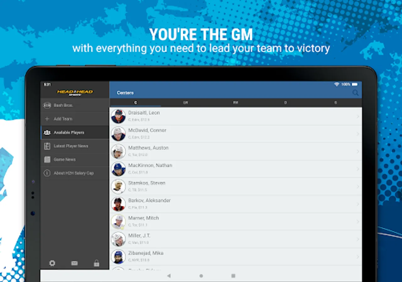 Using a salary cap of $100 Million, pick a team of 8 pro hockey players, a utility position and a goaltender staff that you think will score the most points each week using our unique Head-2-Head scoring system.