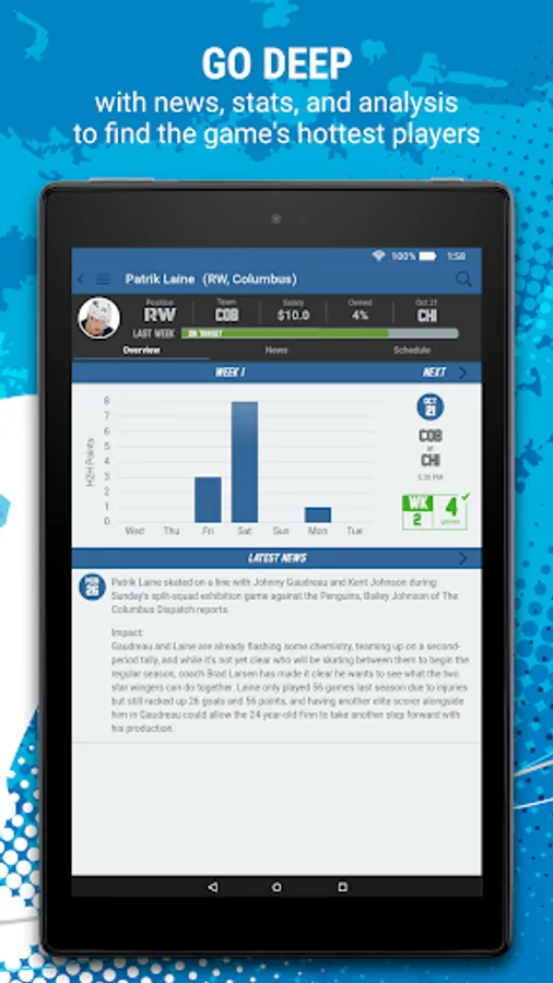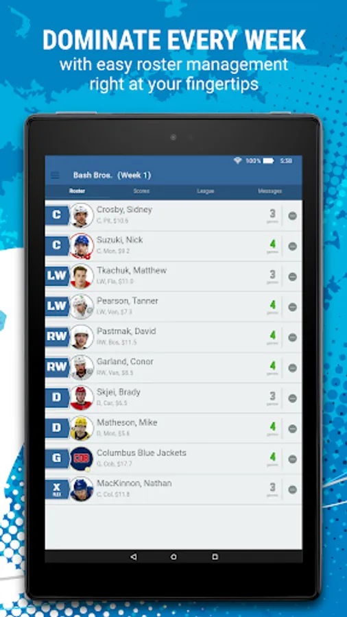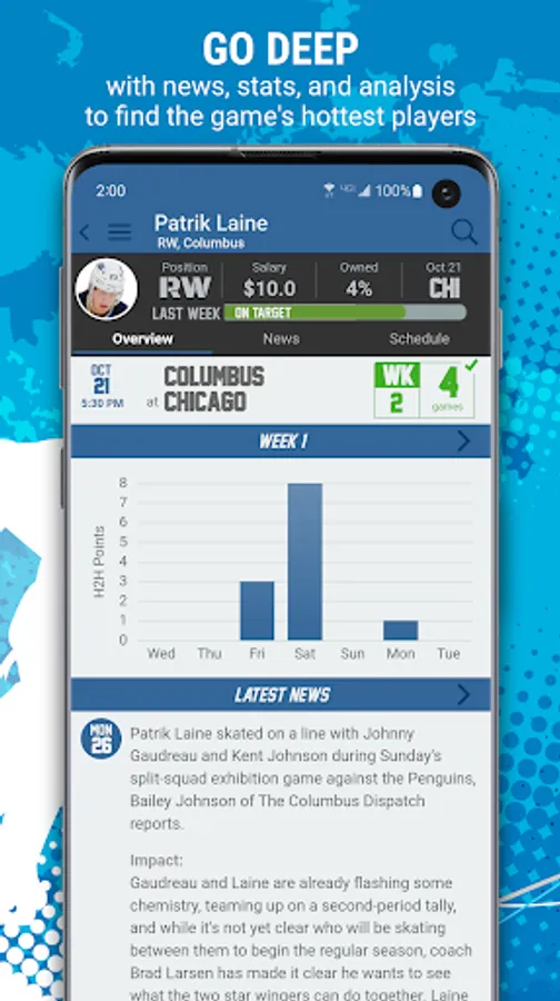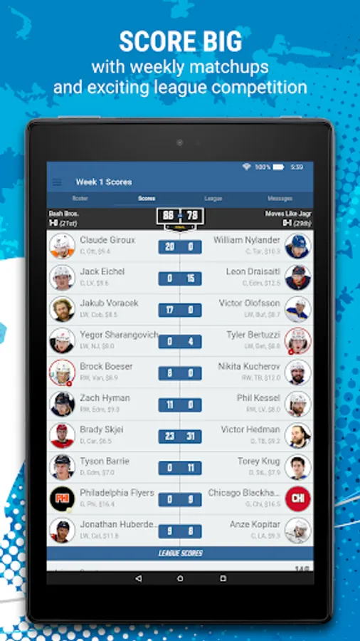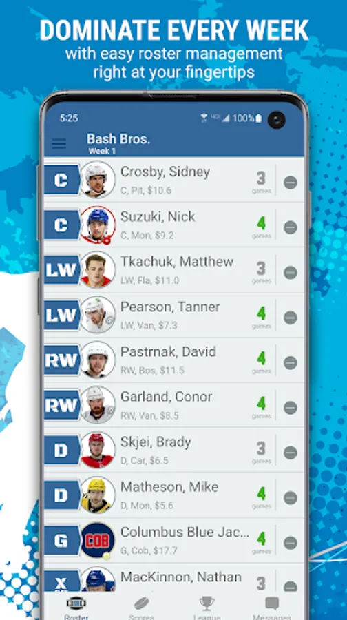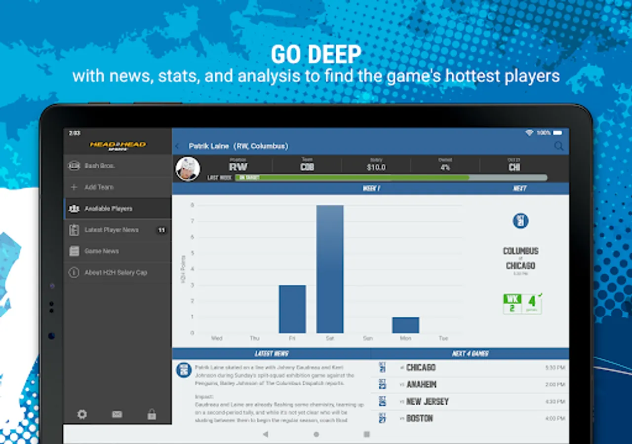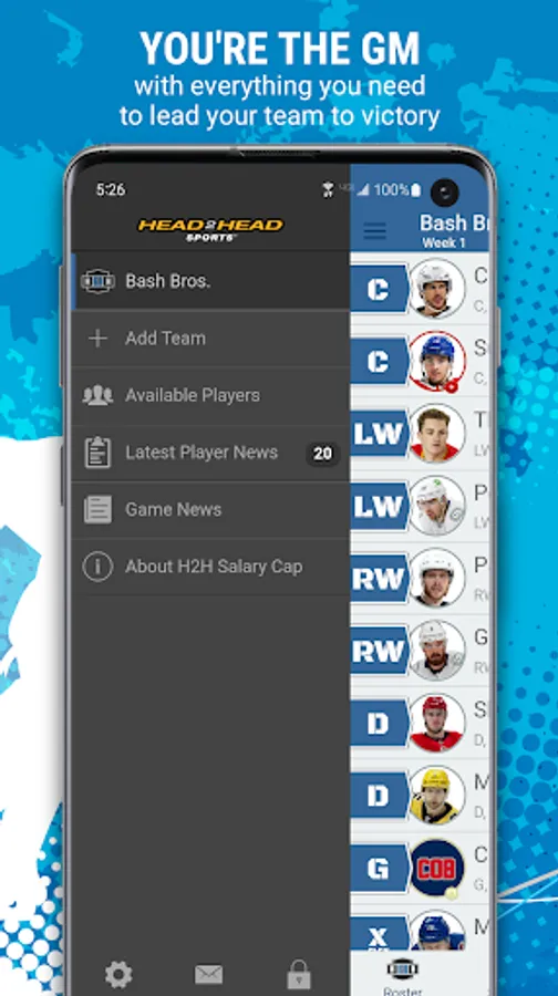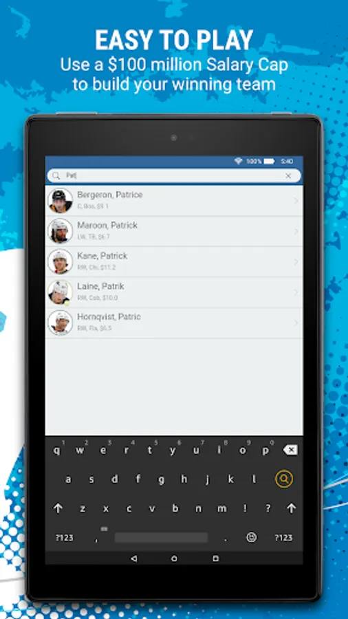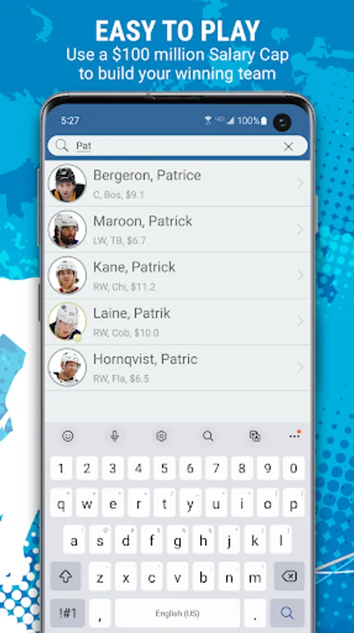 Using a salary cap of $100 Million, pick a team of 8 pro hockey players, a utility position and a goaltender staff that you think will score the most points each week using our unique Head-2-Head scoring system.