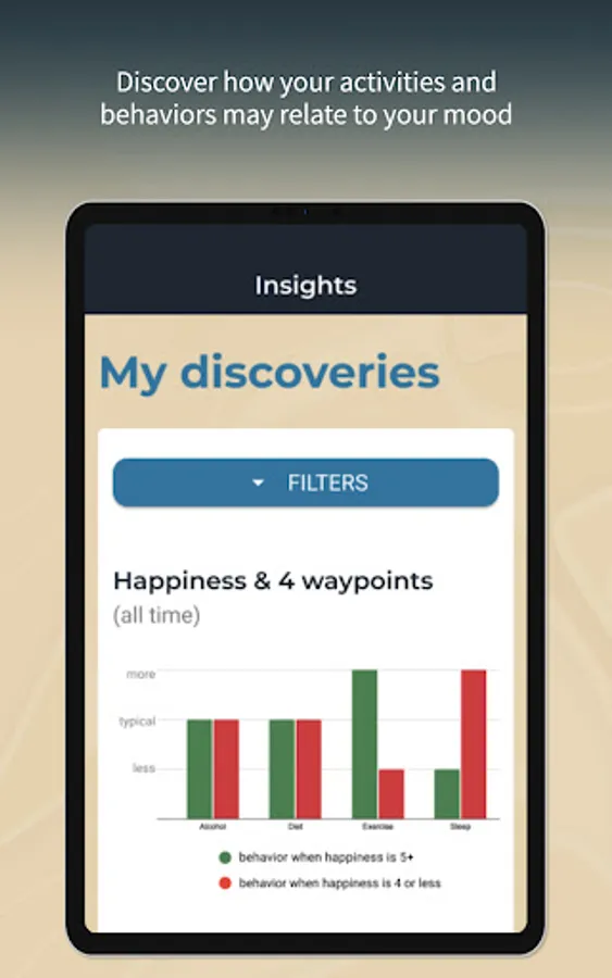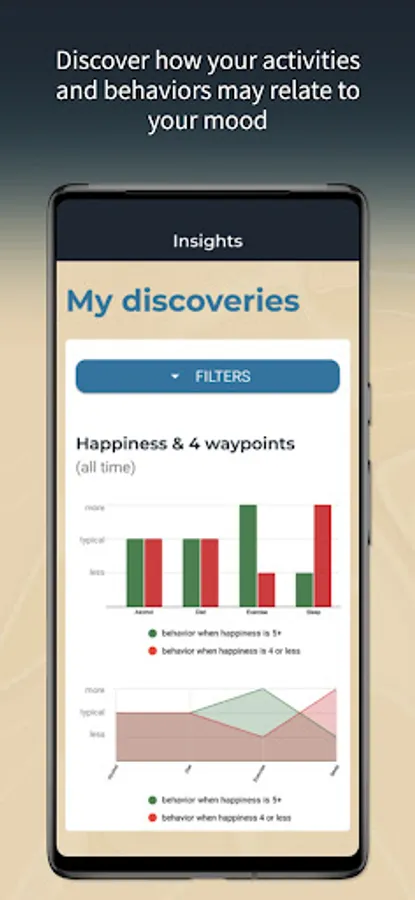 - Unlock interactive charts and filters that enable you to truly explore how your tracked behaviors may be relating to your mood