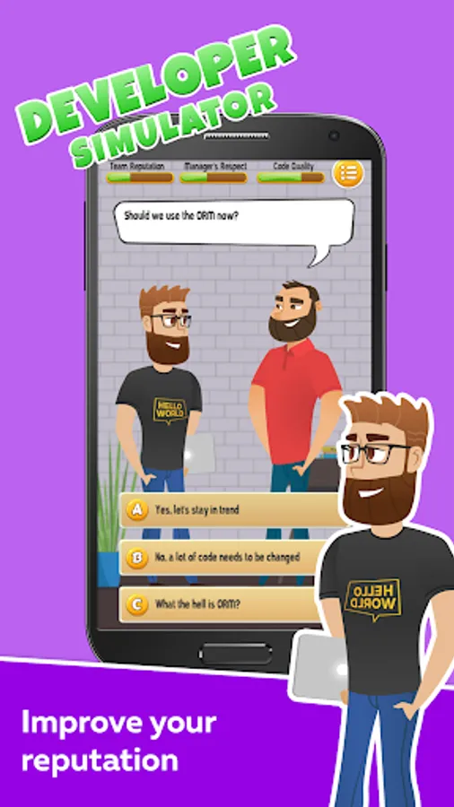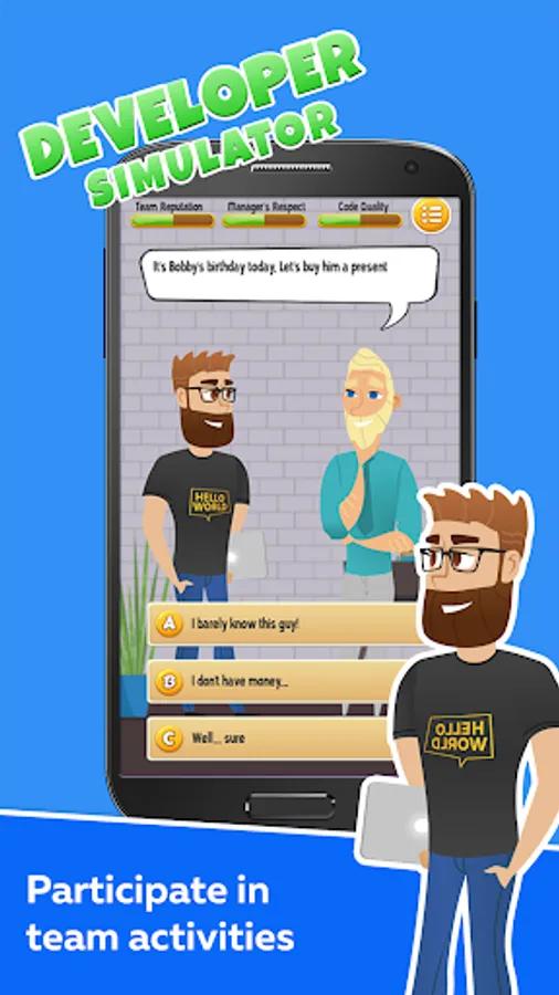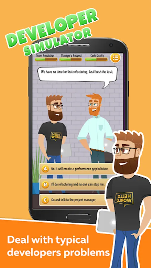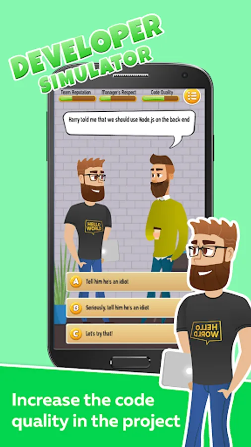 This developer simulator shows you different situations, and you can chose a reaction to any of them. Every decision you pick will reflect to one of these 3 indicators: