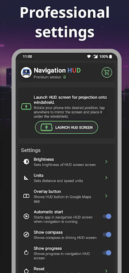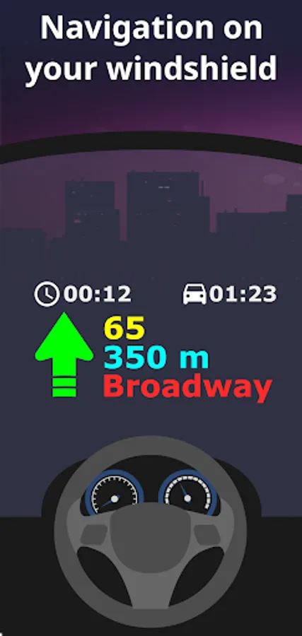 It transforms your phone into head-up display (HUD) showing navigation directions from Google Maps app. The HUD screen supports normal viewing and HUD mode which mirrors the display at night for viewing navigation as a reflection on windshield. It increases your safety by projecting all navigation information right in your line of sight. Just start navigation, flip the screen by tapping on it and place your smart phone under the windshield. It's that easy!