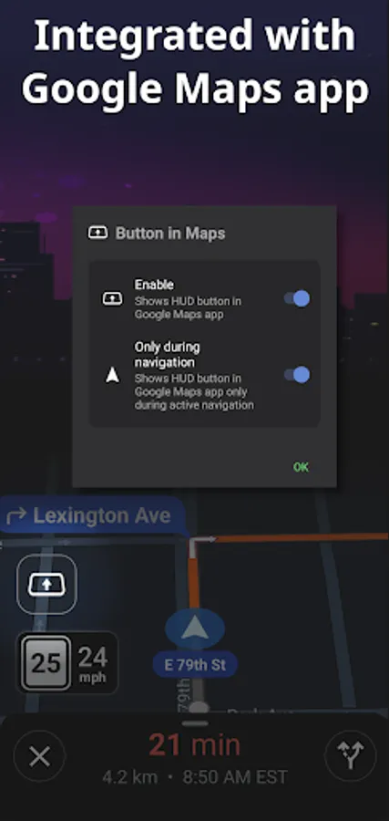 This app uses Accessibility services in order to detect foreground Google Maps app and launch automatically. All trademarks belong to their respective owners. Google Maps is used in screenshots for demonstration purposes only.