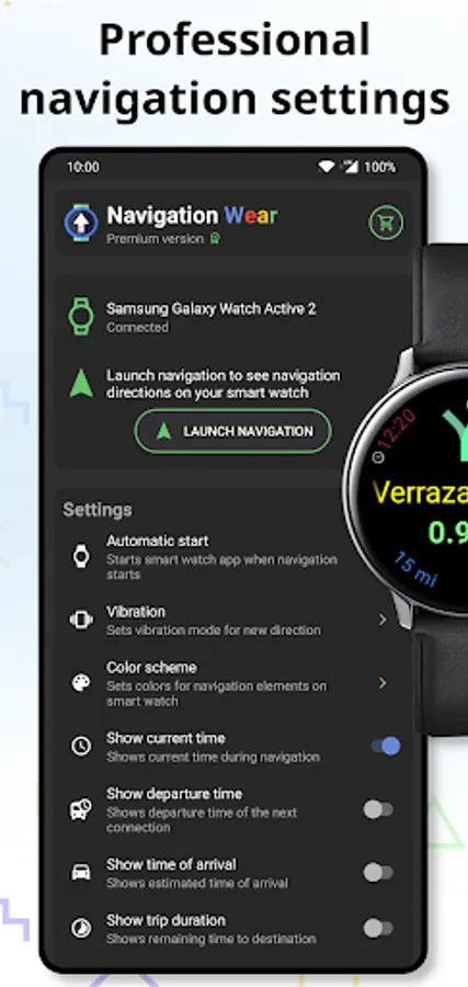 Navigation Wear app displays navigation directions from your smartphone on your smartwatch. Navigation Wear app starts automatically on your smart watch after launching maps turn by turn GPS navigation on your phone. Look and feel of GPS navigation on your smart watch is customisable using premium settings.