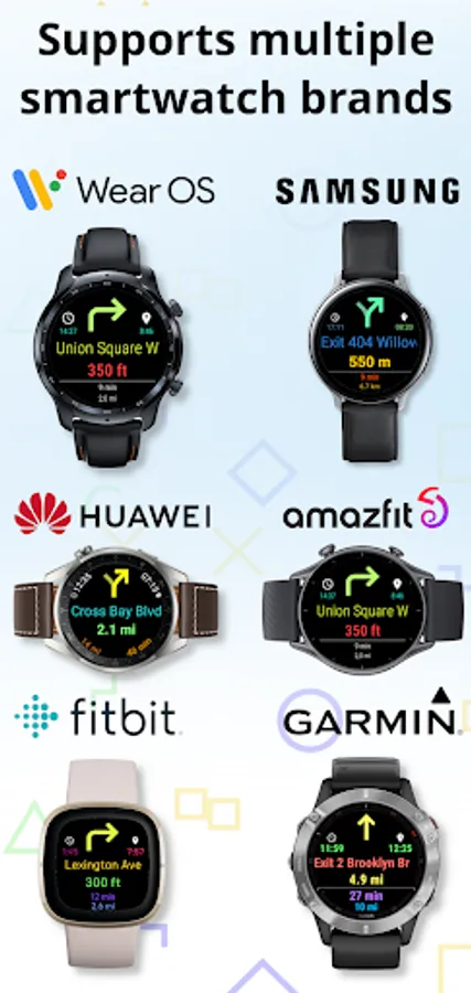 Navigation Wear app is compatible ONLY with Samsung, Wear OS, Huawei, Fitbit, Garmin and Amazfit smart watches. It requires free companion app "Navigation Wear" installed on your smart watch.