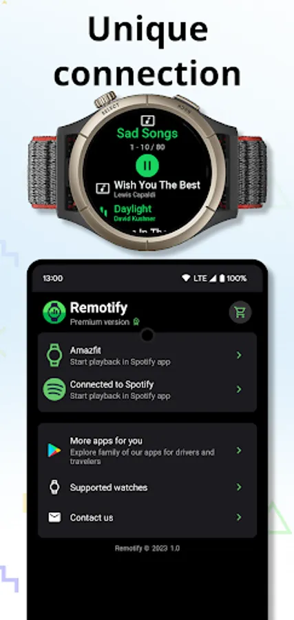 Premium version of Remotify enables you to manage your favorite songs in Spotify app and start playback of song or playlist right from your Amazfit smart watch.