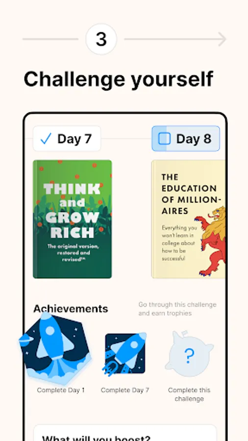 Boost any life area with our gamified challenges: Success, Wealth, Healthy Relationships, Modern Parenting, Self-Confidence, Emotional Intelligence, and many more. Choose the area you want to improve and follow the challenge to see excellent results in less than a month.