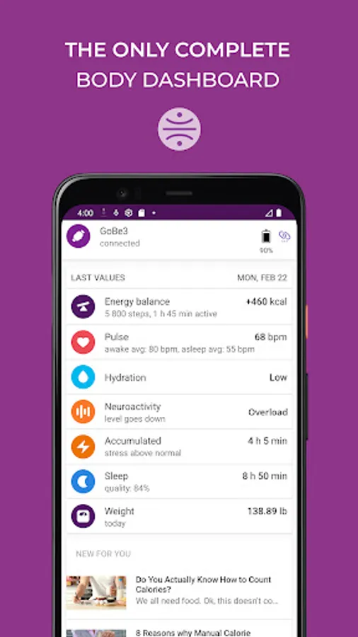Change your lifestyle consciously and see how your body reacts with GoBe - the only smart band that measures calorie Intake, body hydration level and nervous system activity automatically.