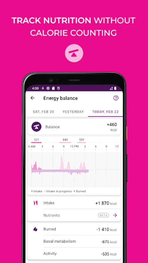 - Calorie Intake and Burned calories with their balance shown separately as Energy balance