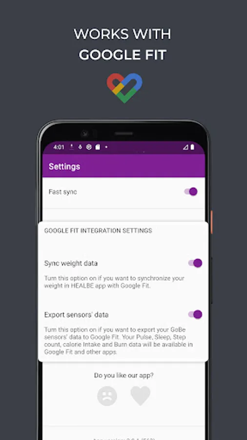 In addition, you can set up weight data exchange to keep it up to date with ease, no matter if you want to add data from Google Fit (for example, from smart scales) or in the HEALBE GoBe app. Stay healthy and enjoy the integration possibilities!