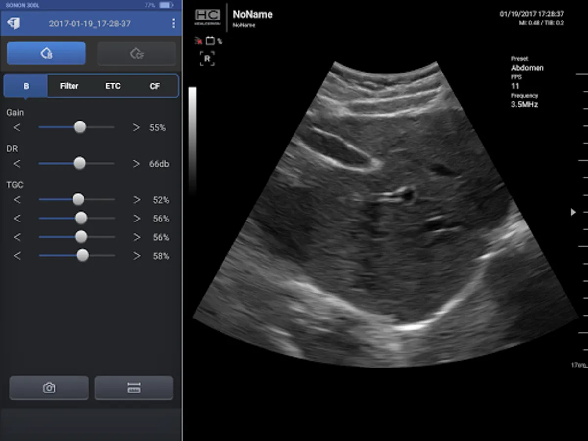 The SONON300L is a mobile wireless ultrasound device that can be operated easily with on hand. The SONON300L transmits ultrasound images via wireless access points to any mobile-based tablet or mobile phone screen.