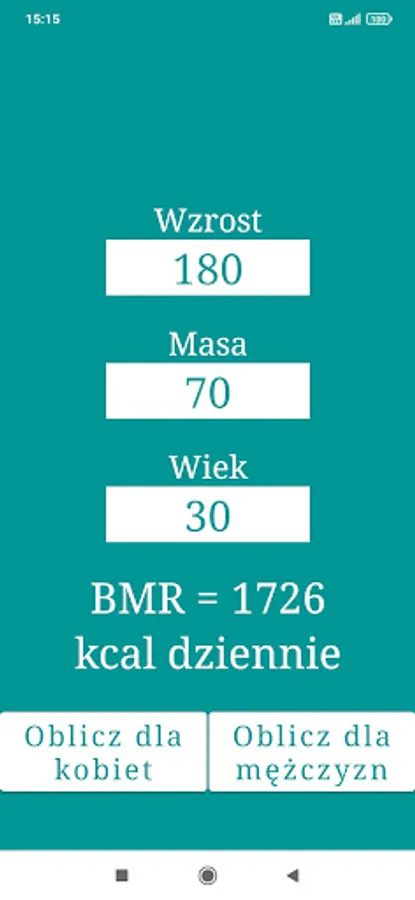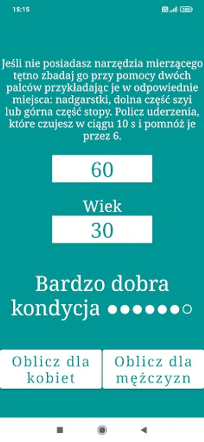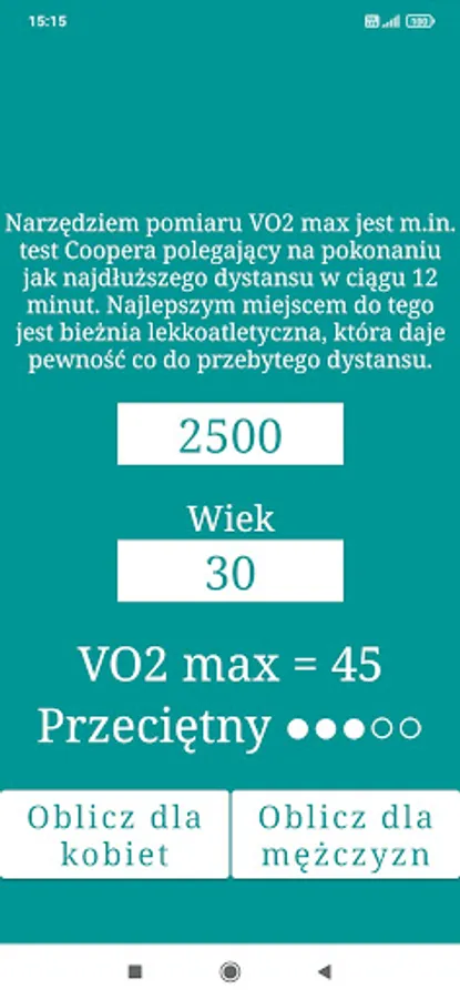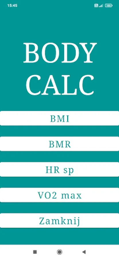 4-in-1 calculator for BMI (body mass index), BMR (caloric demand), physical condition based on HR sp (heart rate) and VO2 max (VO2 max) based on the Cooper test.