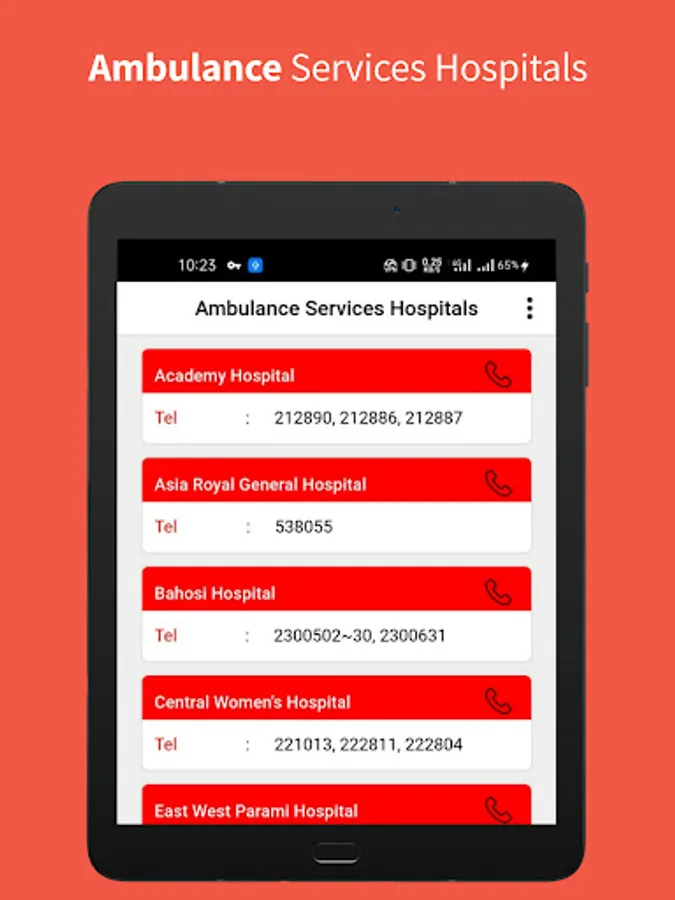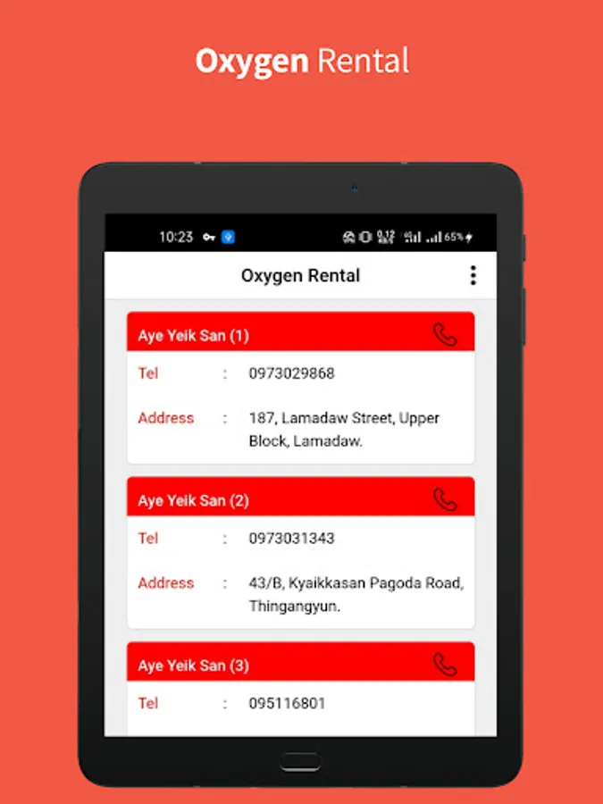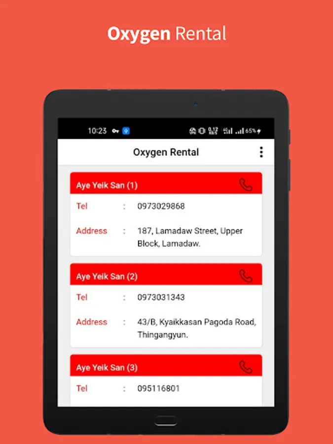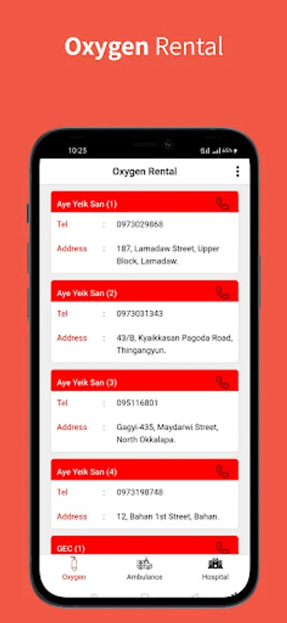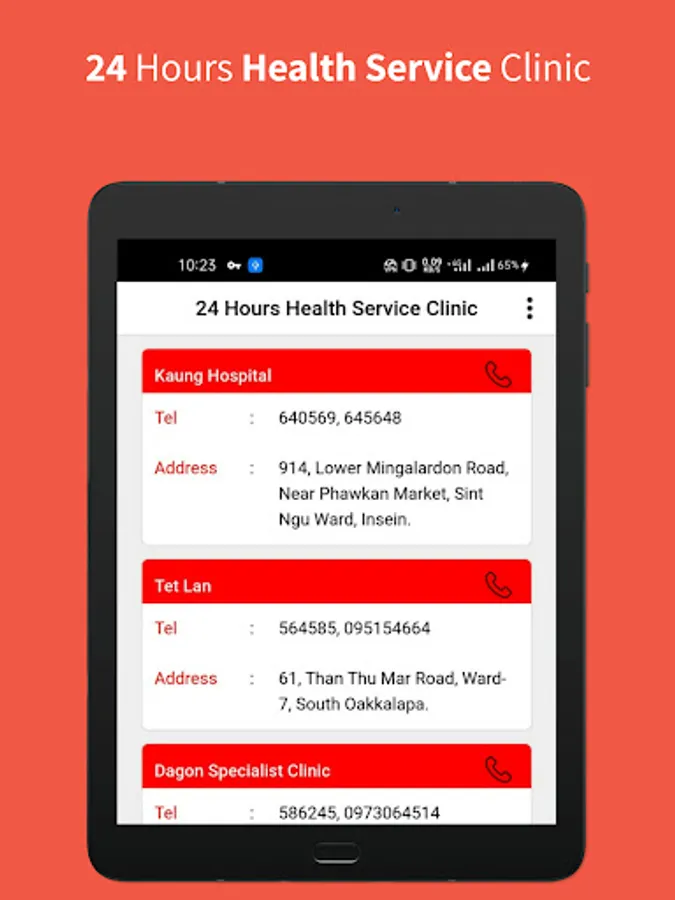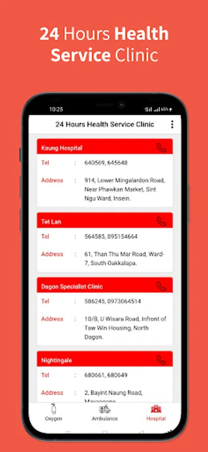 This App contains Addresses And Phone Numbers Of Most Hospitals And Clinics Located In Yangon Region. Emergency Phone Numbers Can Be Called For Oxygen And Ambulance.