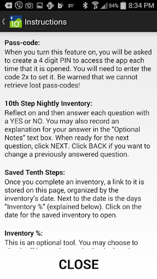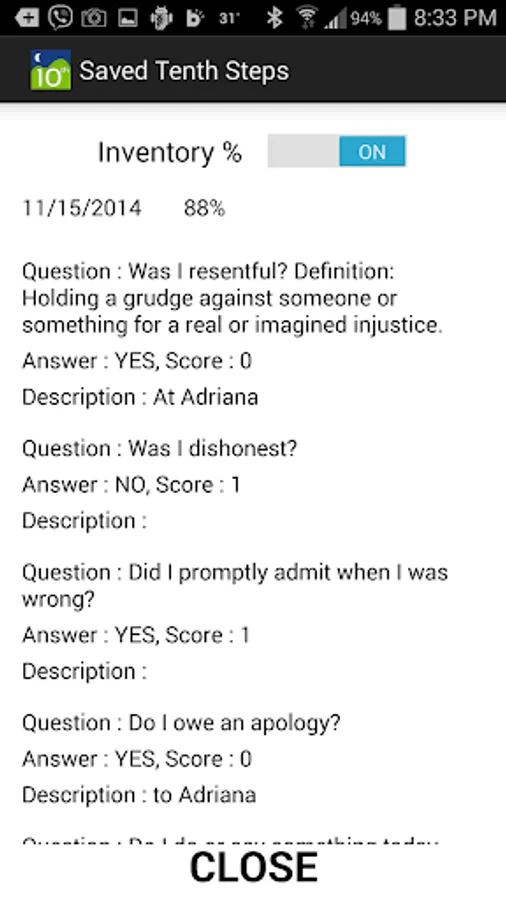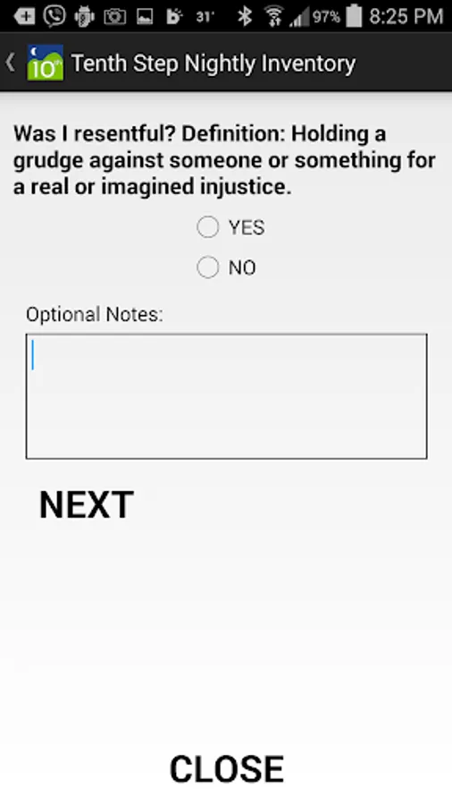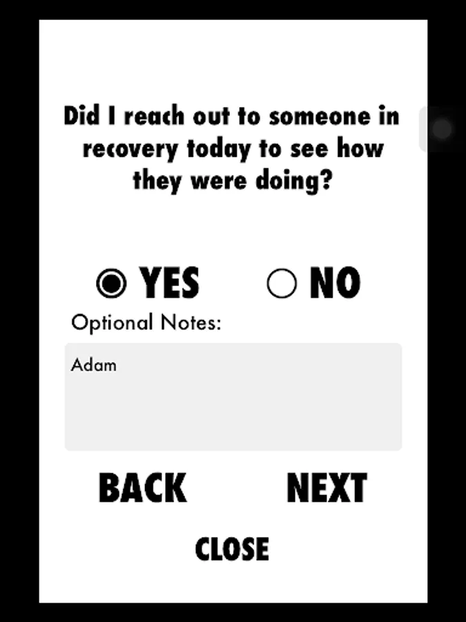 Tenth Step inventory app that was created by members to help simplify their daily inventory. It doesn’t get easier than this. Reflect on ten yes or no questions at the end of your day to help you complete your daily inventory. Inventories are saved and stored by date. Optional tool within the app lets you “track” how well you’re walking on the 12th Step beam over time, depending on how you answer each days questions.