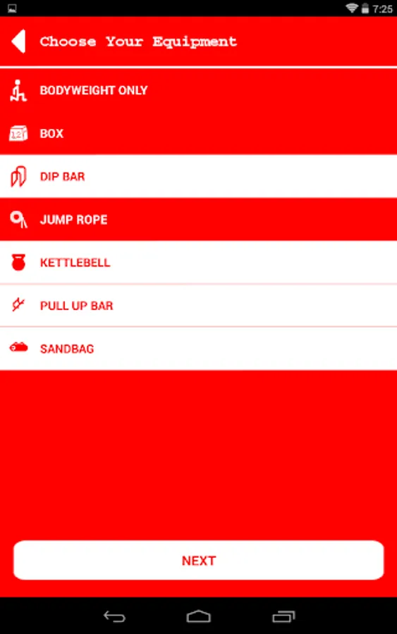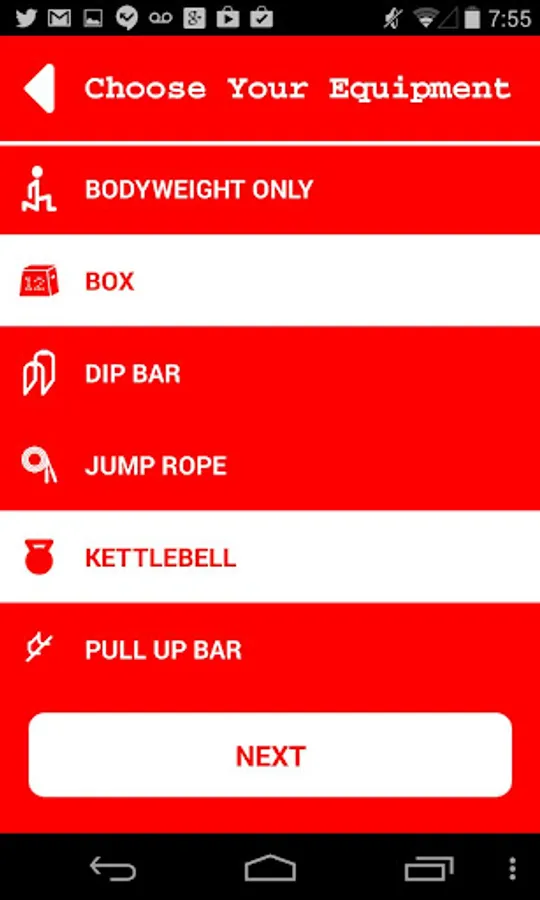 - Seven possible equipment choices with option to choose bodyweight-only workout as well.