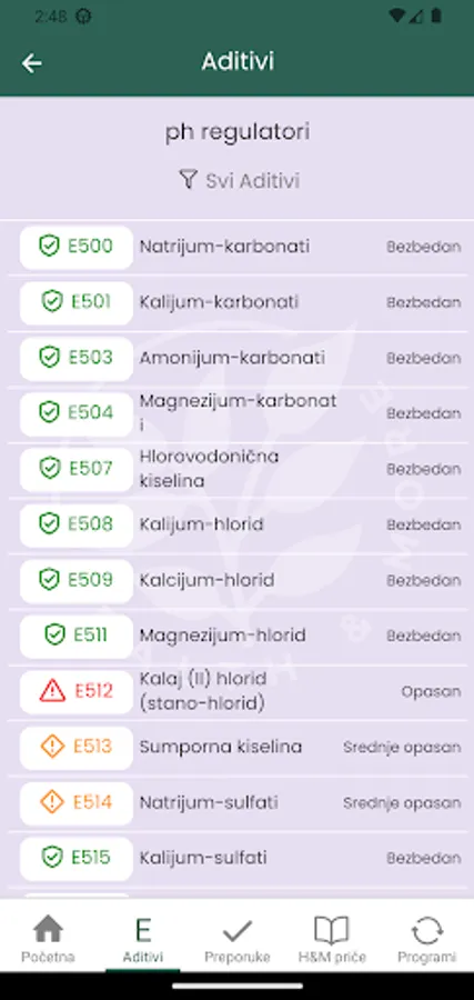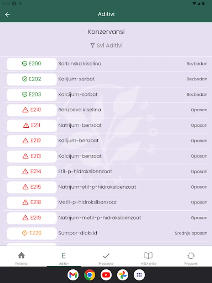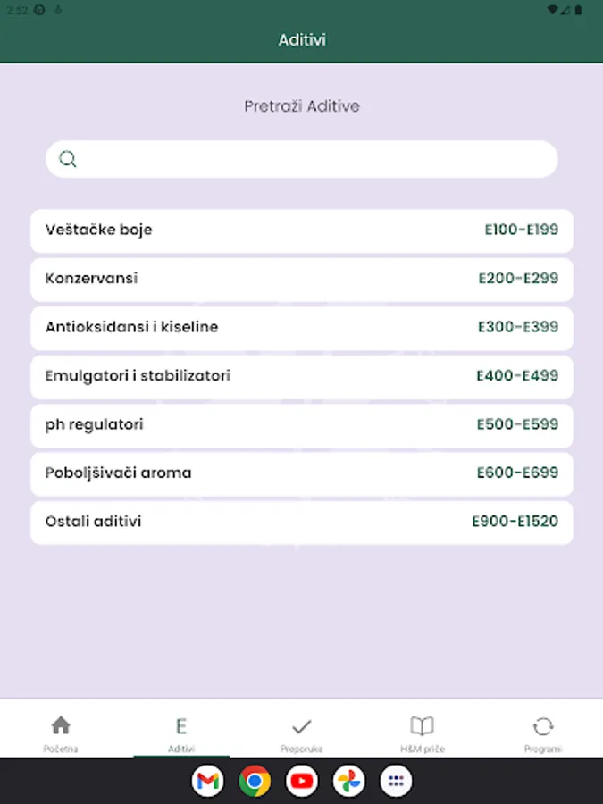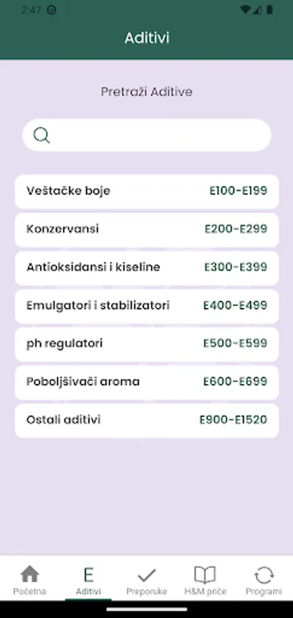 U aplikaciji, navedeni su svi aditivi, koji su zakonski dozvoljeni za upotrebu sa kratkim opisom, koji govori u prilog bezbednosti ili potencijalne štetnosti aditiva i sortirani prema bezbednosti/štetnosti na aditive označene crvenom bojom, narandžastom bojom, zelenom bojom, tako da: