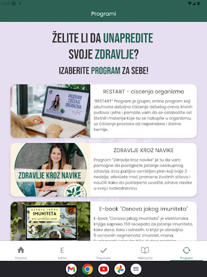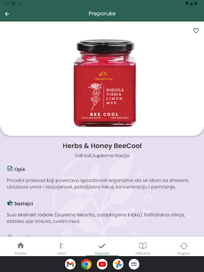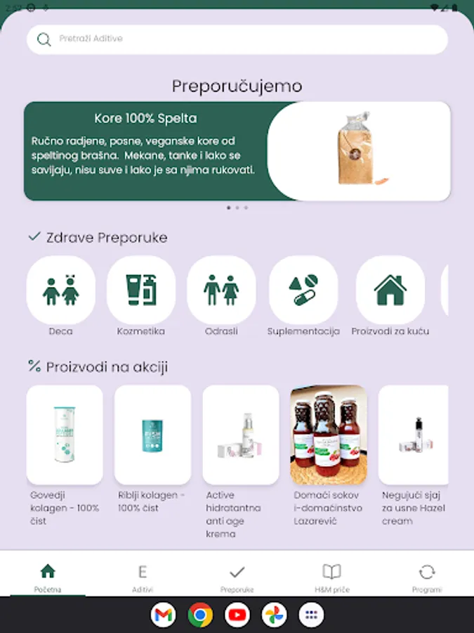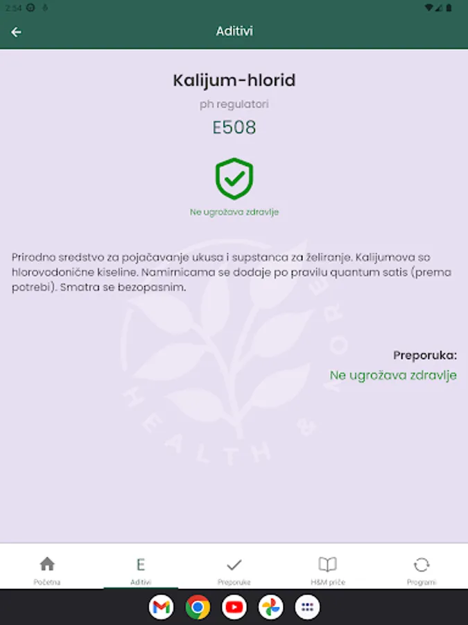 Da li znamo šta jedemo? Činjenica je da 90% stanovništva zna naziv namirnice, ali ne zna od čega je ona izradjena. Ova aplikacija do detalja opisuje šta znači naziv supstance koja je dodata, da li je bezbedna po ljudsko zdravlje i u kojoj meri.