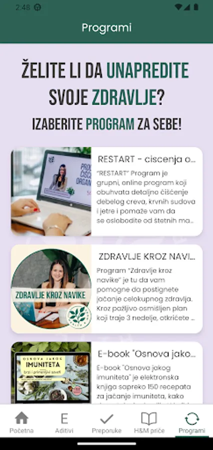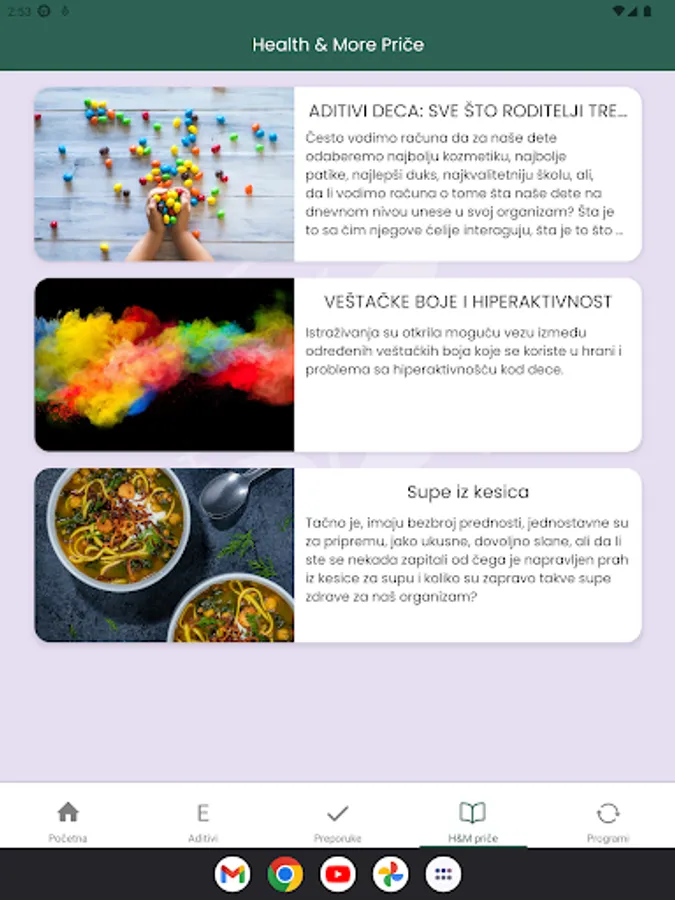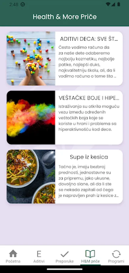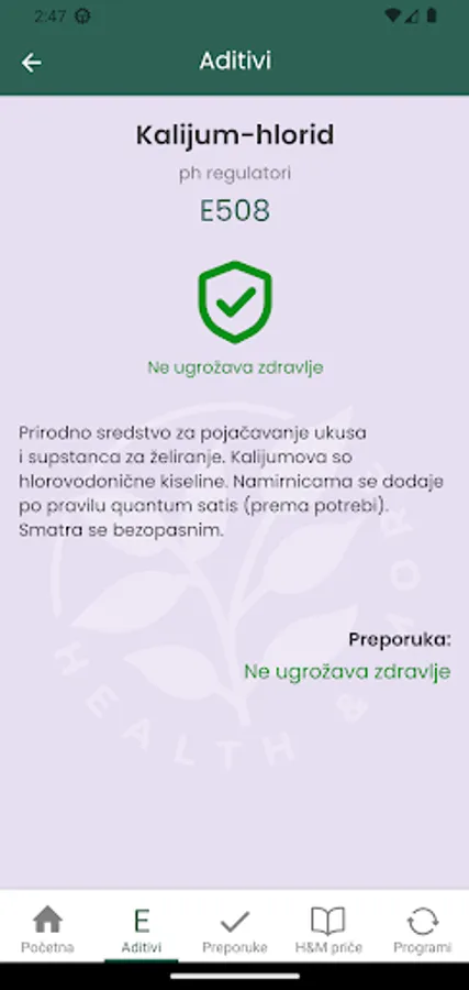 Imajući u vidu činjenicu da su mnogi aditivi, koji su korišćeni kao bezbedni, nakon 10, 15 ili čak 20 godina isključeni iz upotrebe zbog dokazane genotoksičnosti, kancerogenosti, neurotoksičnosti i sličnih neželjenih dejstava, ova aplikacija pruža uvid u sve aditive, koji su dozvoljeni za ljudsku upotrebu, a za koje postoji sumnja da mogu biti štetni.