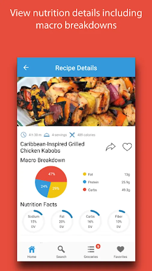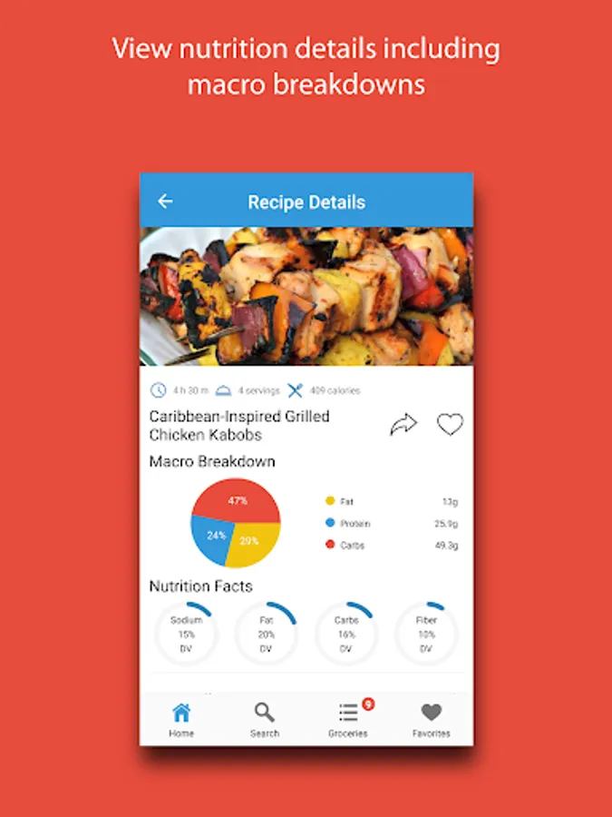 View nutrition facts, macro breakdowns, and cooking directions for any recipe.