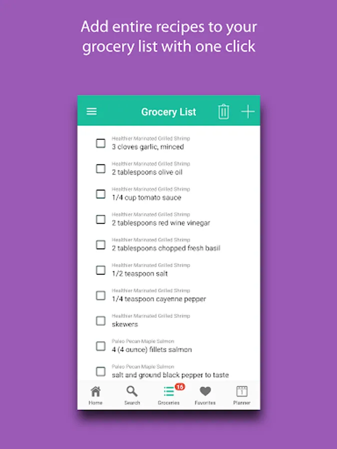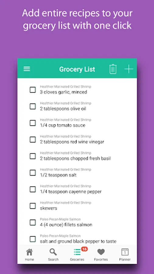 Easily add ingredient details for any recipe to your grocery list.