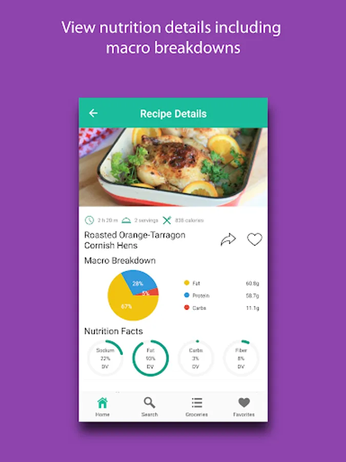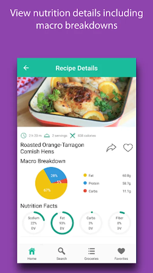 View nutrition facts, macro breakdowns, and cooking directions for any recipe.