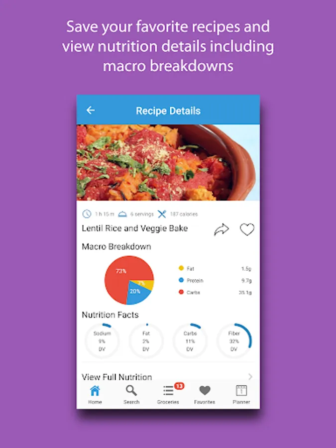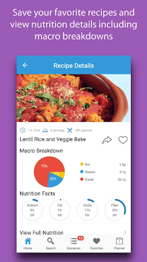 View nutrition facts, macro breakdowns, and cooking directions for any recipe.