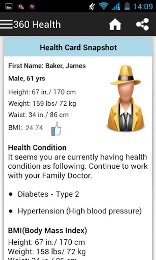 The App also measures possibility for you to have certain Chronic Health Conditions like Diabetes, CVD, and CHD etc. and gives you preventive recommendations.