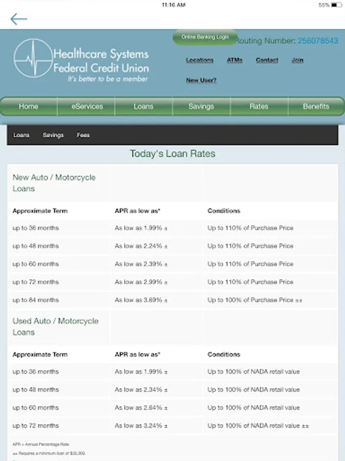 · Online Services: E-Statements, bill pay, check order, member alerts, loan application, and tax information.