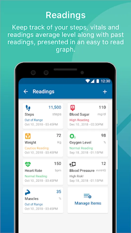 ¬ Readings: Keep track of your weight, number of steps you take every day, blood pressure, temperature, heart rate, oxygen level, blood sugar readings & average level along with past readings, presented in an easy to read graph.