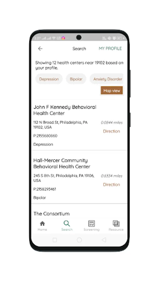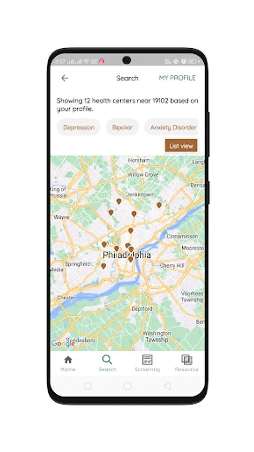 Health E Livin provides an opportunity for everyone to anonymously assess their mental health. The app has 4 screening tools; depression screening, anxiety disorder screening, mood disorder screening, and post-traumatic stress disorder screening. Once complete and according to the score, the user will receive a recommendation for evaluation and be directed to the mental health center nearest their location.