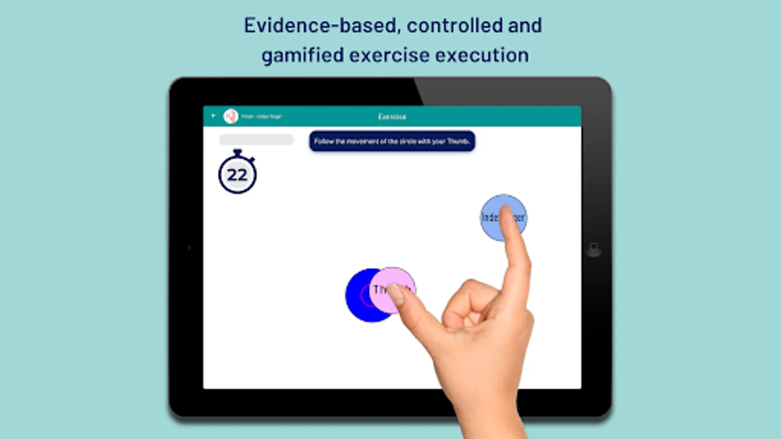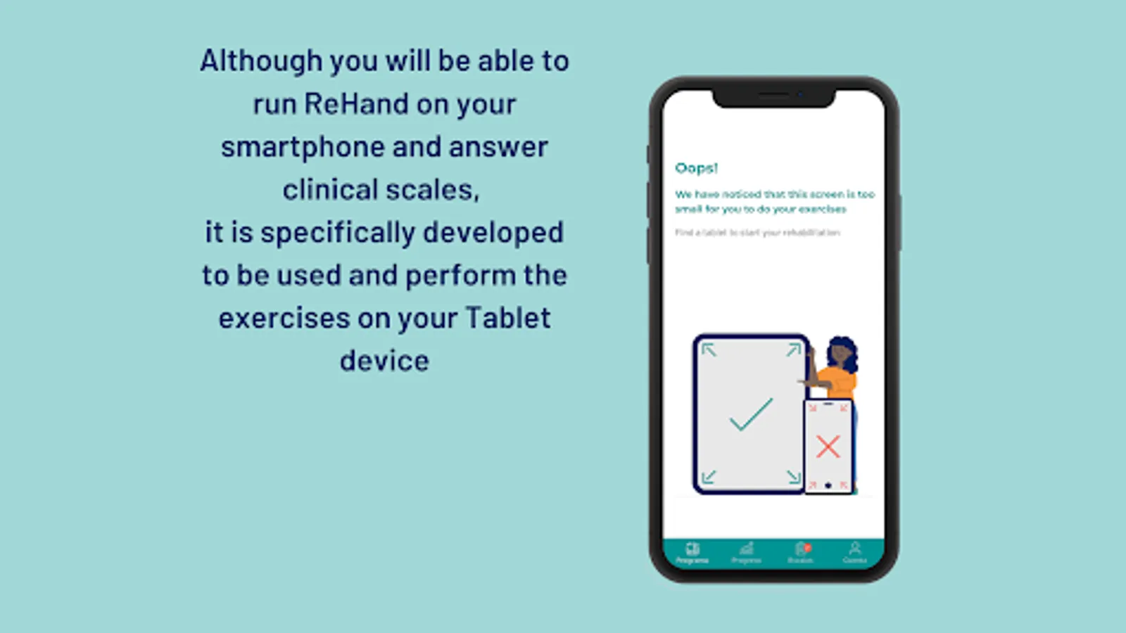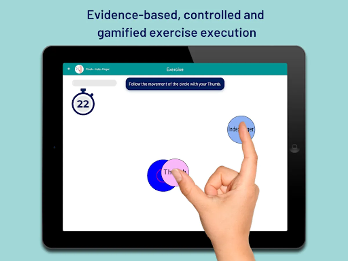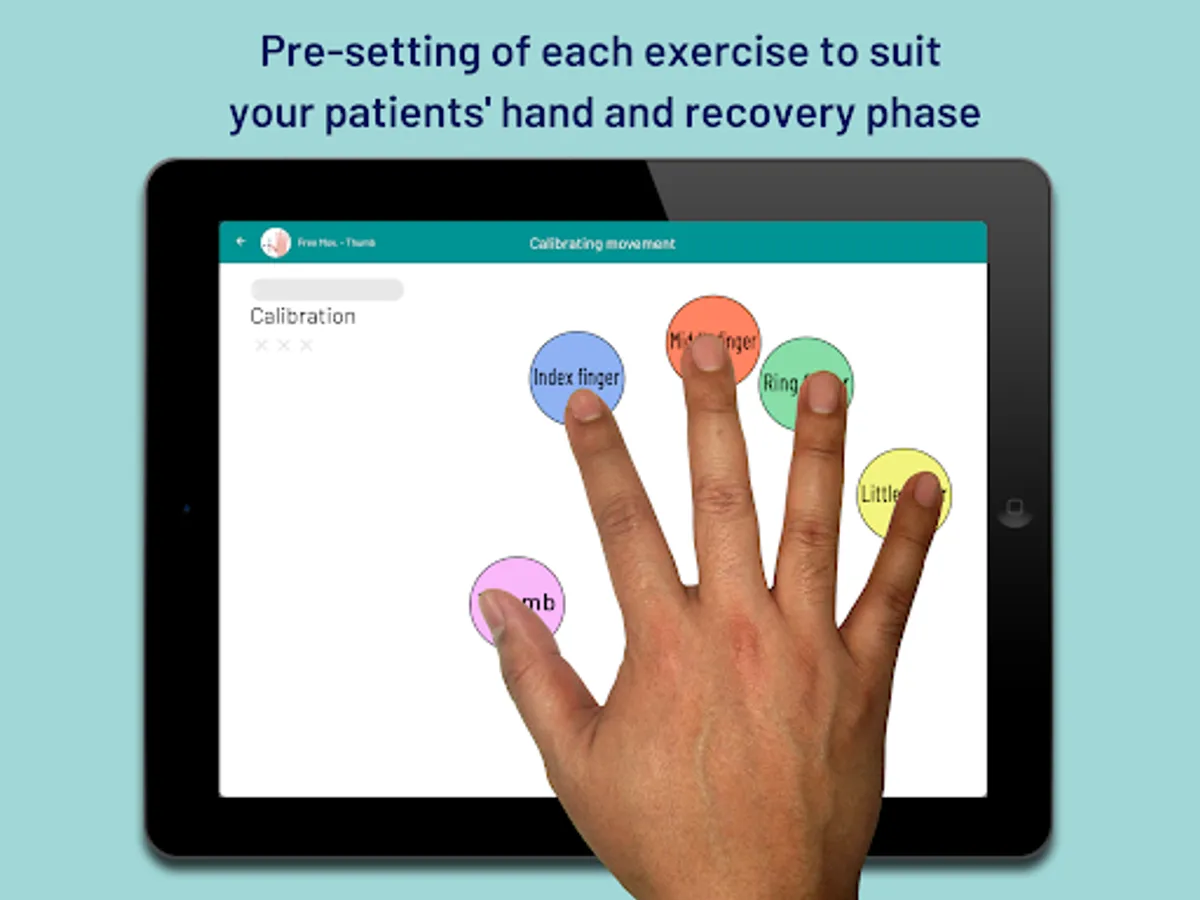 ReHand has been developed by a team of healthcare professionals including surgeons, physiotherapists, physicians and occupational therapists. The exercise programs implemented are evidence-based. All exercises are performed through touches and movements on the tablet screen and guided by feedback, allowing the retraining of the functional ability of the wrist-hand-fingers segment. Prior to each exercise an adjustment is made, ensuring that the work by the patient is always painless and in accordance with his/her limitation of movement. The exercises are adapted and progressed according to the patient's evolution, seeking the challenging and attentive character that these interventions require. The app also presents explanatory videos at the beginning of each exercise and audio instructions.