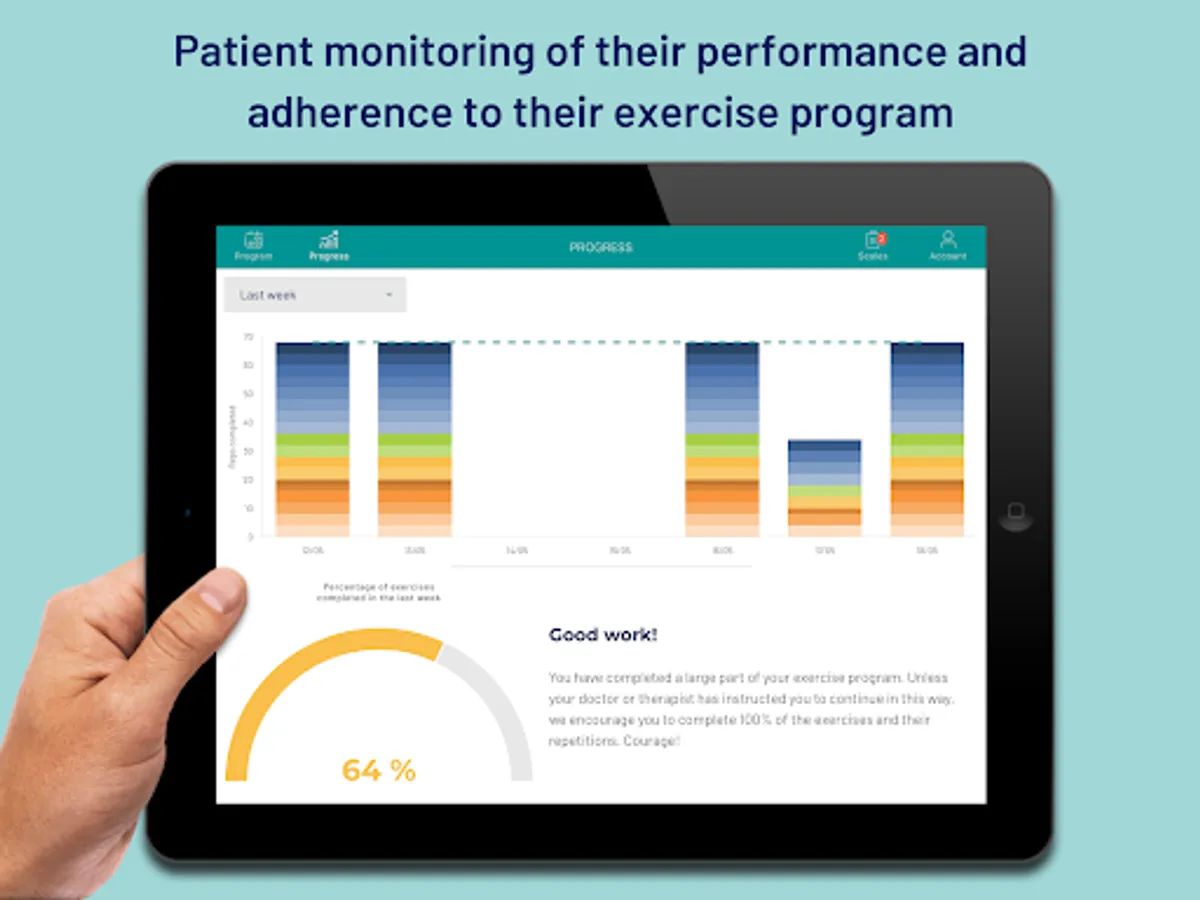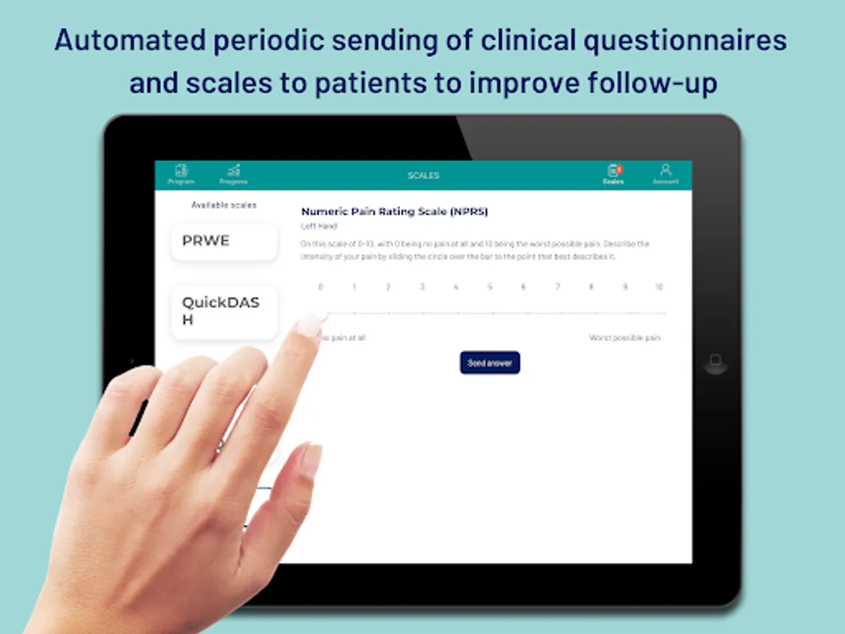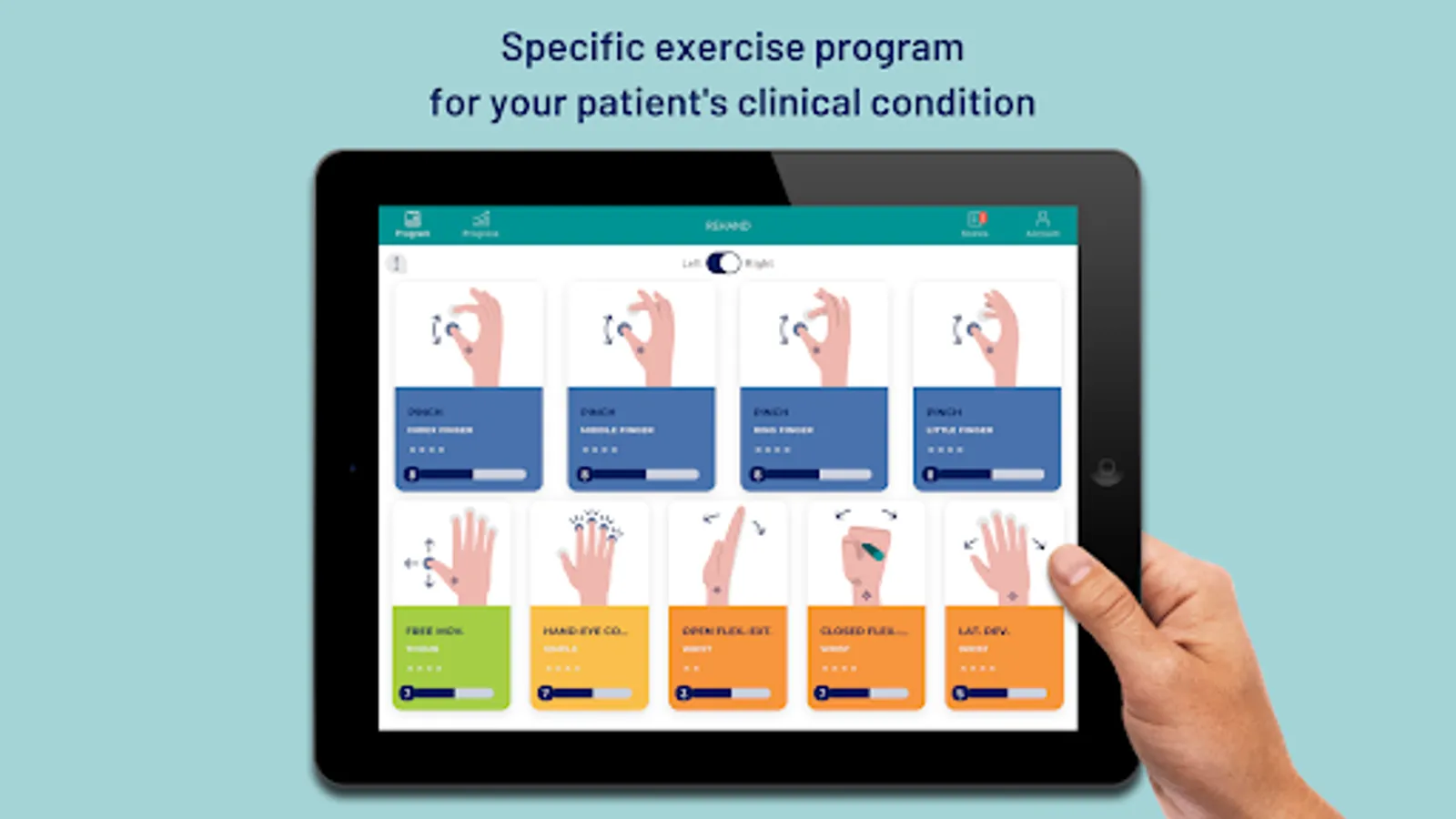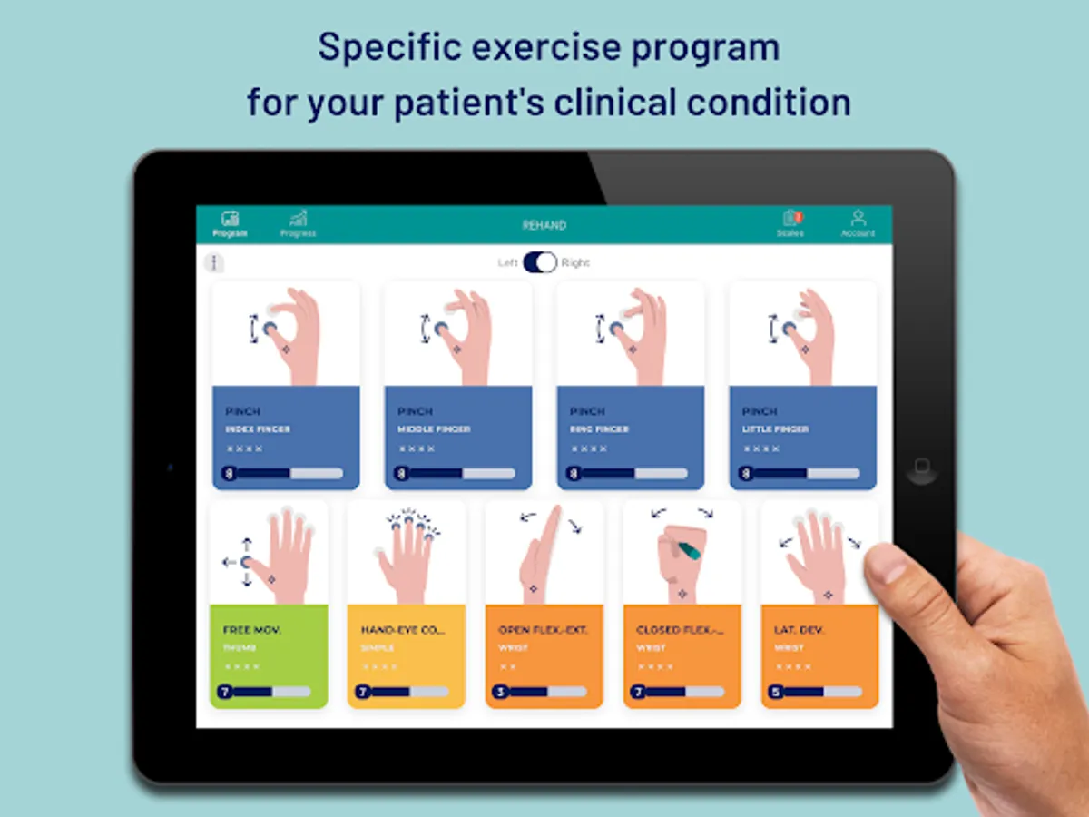 ReHand is a tool for the prescription and implementation of therapeutic exercise programs for the rehabilitation of the wrist-hand-finger segment. Its use is indicated for patients with trauma, orthopedic and/or neurological involvement of the wrist-hand-finger segment. ReHand provides patients with an exercise program adapted to their condition and recovery moment. It also provides healthcare professionals with a therapeutic exercise prescription and monitoring tool.