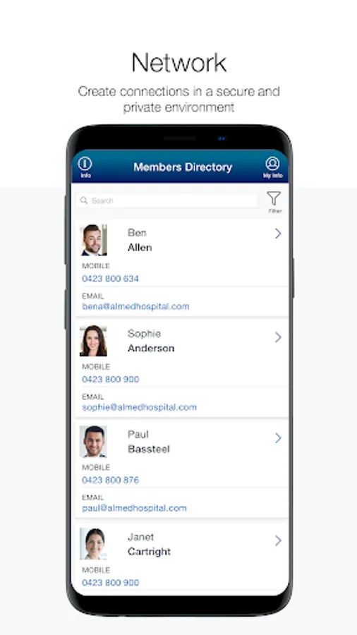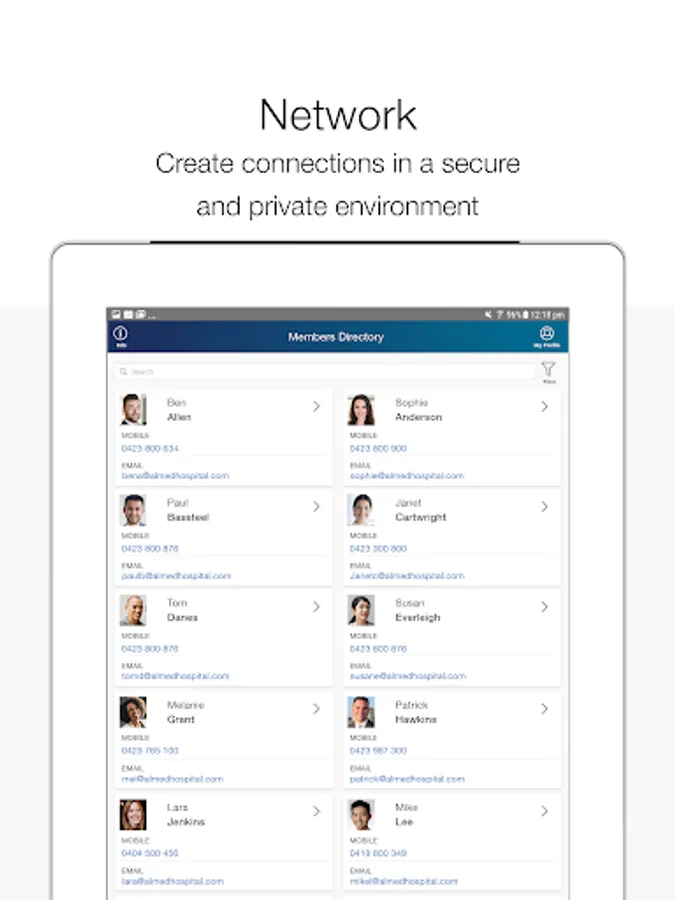 • Hospital Departments - Easily share, access, search and become aware of important information within the department e.g. rosters, presentations from journal clubs etc