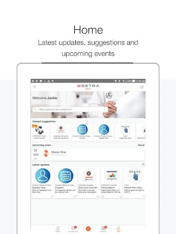 The platform creates an engaging personal connection between healthcare professionals and their teams, hospital departments, medical associations, special interest groups, events and industry - all in one place. Providing the right content at the right time - wherever they are, whenever they need it.