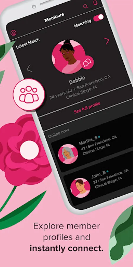 Let us connect you with a new member from our community every day. We’ll recommend members to you based on your treatment plan, lifestyle interests, and needs. Browse member profiles and request to connect with anyone from our community with members listed as “Online now.”