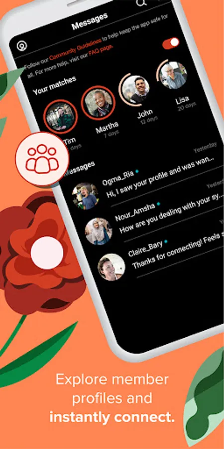 Let us connect you with a new member from our community every day. We’ll recommend members to you based on your treatment plan, lifestyle interests, and needs. Browse member profiles and request to connect with anyone from our community with members listed as “Online now.”