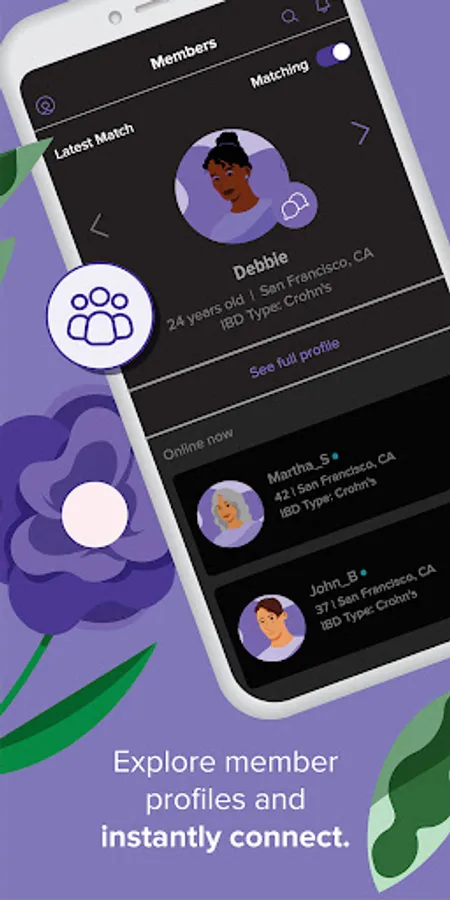 Let us connect you with a new member from our community every day. We’ll recommend members to you based on your treatment plan, lifestyle interests, and needs. Browse member profiles and request to connect with anyone from our community with members listed as “Online Now.”