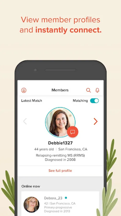 Let us connect you with a new member from our community every day. We’ll recommend members to you based on your treatment plan, lifestyle interests, and needs. Browse member profiles and request to connect with anyone from our community with members listed as “Online now.”