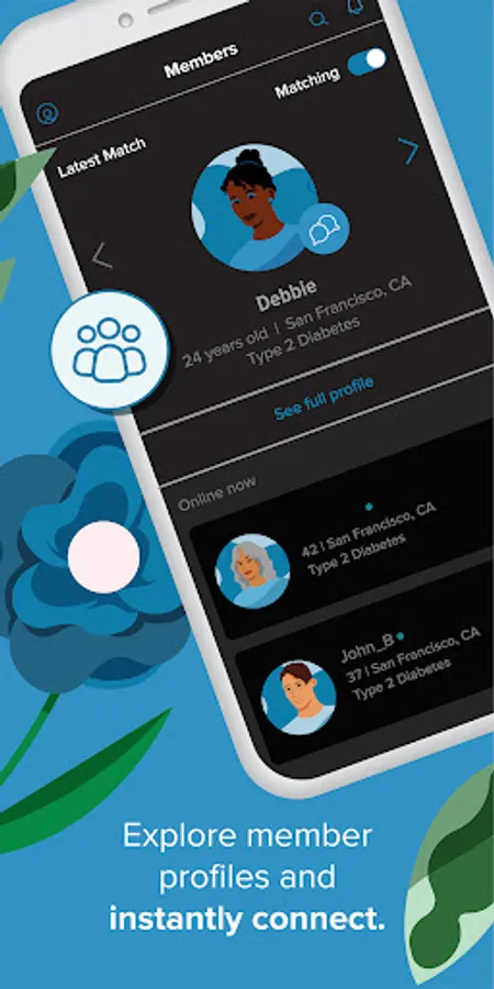 Let us connect you with a new member from our community every day. We’ll recommend members to you based on your treatment plan, lifestyle interests, and needs. Browse member profiles and request to connect with anyone from our community with members listed as “Online Now.”