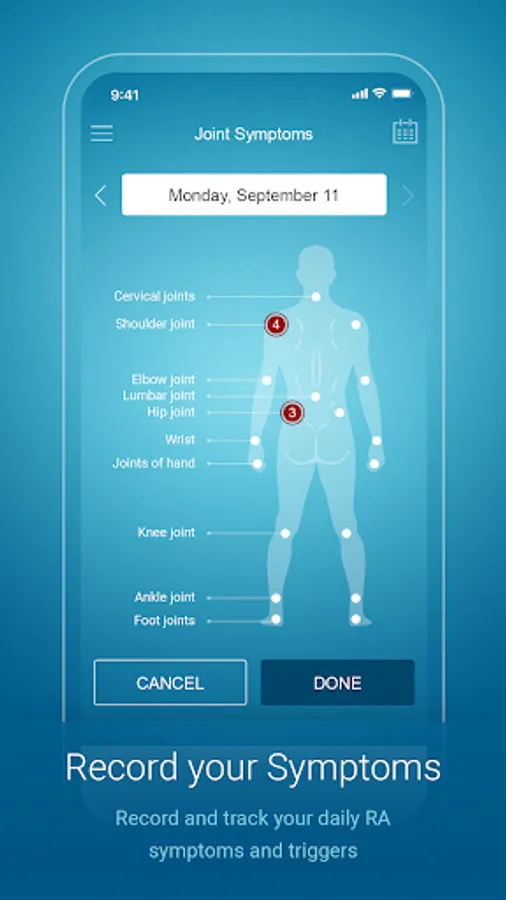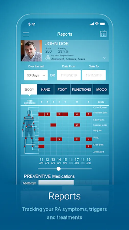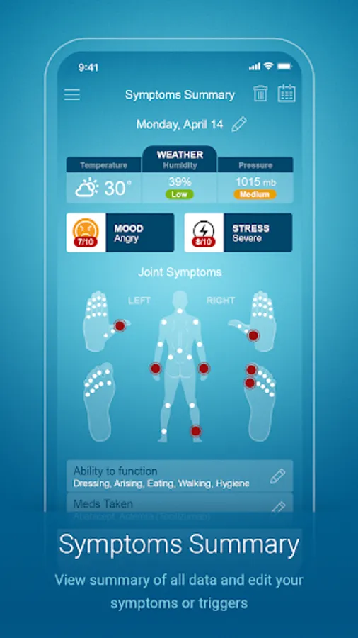 -Highly intuitive RA Symptoms Tracker (Location, function impairment, weather, menstrual cycle, stress)