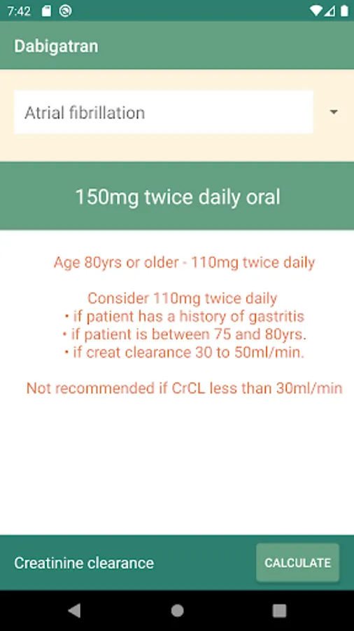 The Dabigatran App provides the correct dose for each indication with advice about possible dose changes in the presence of renal impairment