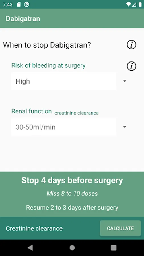 A common question with any anticoagulant is how long should treatment be stopped before surgery? The Dabigatran App calculates a safe interval between stopping treatment and surgery by including renal function and the time since the last dose. It also offers advice for treatment prior to emergency surgery if the surgery cannot be delayed.