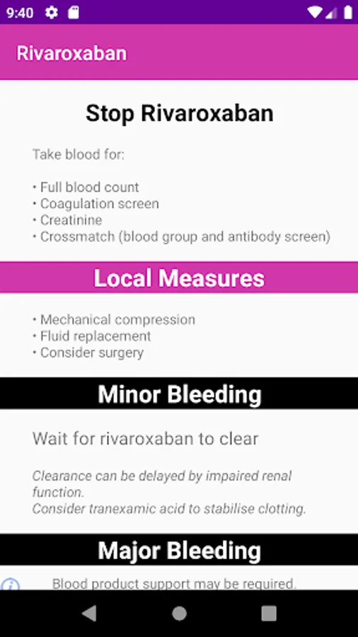 Bleeding is a potential problem with any anticoagulant and can be complex to manage. The Rivaroxaban App provides advice about which treatments to use for both minor and major bleeding.