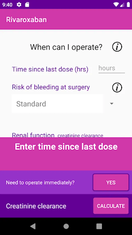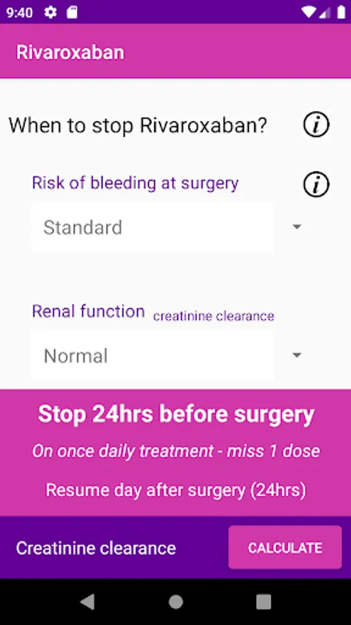 A common question with any anticoagulant is how long should treatment be stopped before surgery? The Rivaroxaban App calculates a safe interval between stopping treatment and surgery and offers advice for treatment prior to emergency surgery if the surgery cannot be delayed.