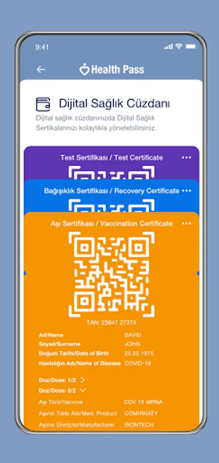 HealthPass Mobile Application developed by the Ministry of Health of the Republic of Turkey for citizens living in the geographical region of the Republic of Turkey; It is an application where you can keep your vaccine, test and immunity certificates in international standards and can be used easily during travel. You can transfer your vaccine, test and immunity information to the HealthPass application and convert it to a certificate via the e-Nabız application, and you can securely store the certificates you produce on your phone.