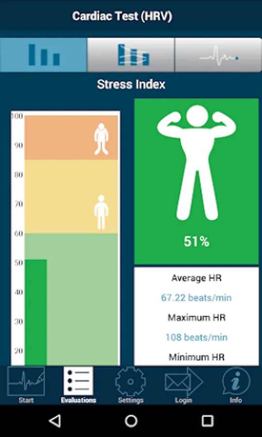 Install the free FitlabCardioCheck App to test your Stress Index. Get a Fitlab Pro license to save and send all your evaluations to our website and to obtain specialized and historical reports (Internet connection is required).