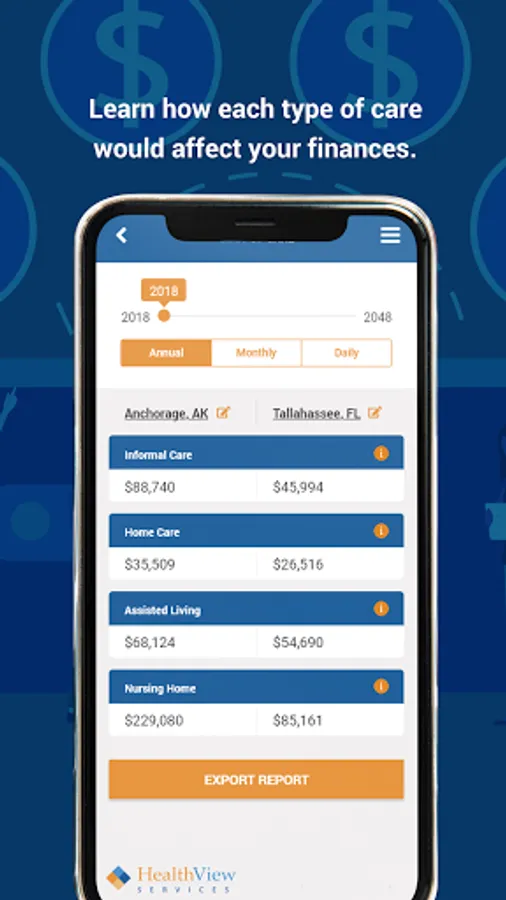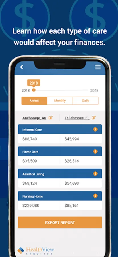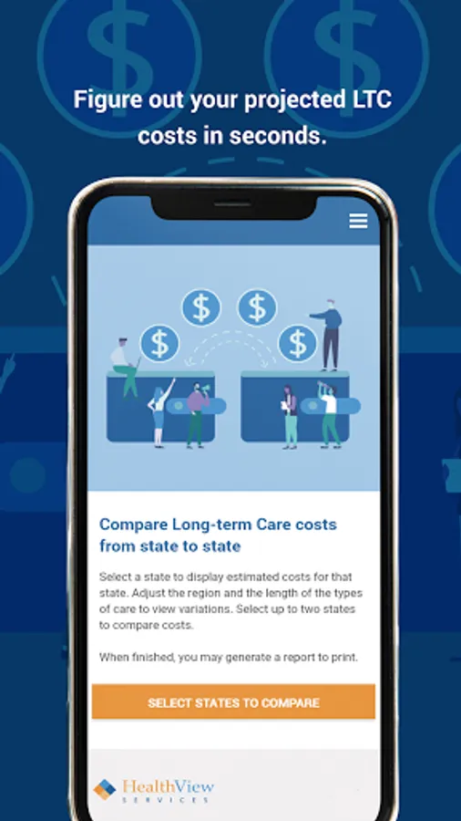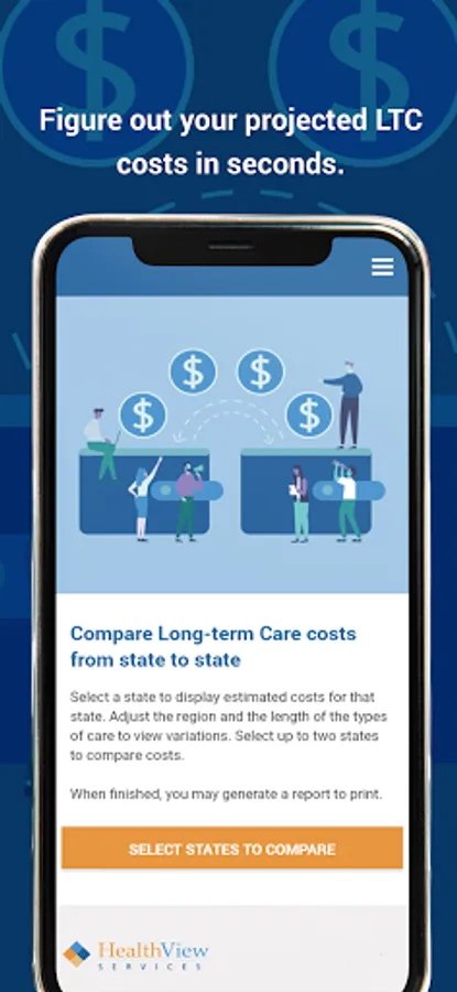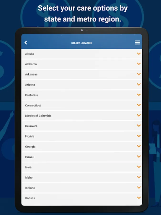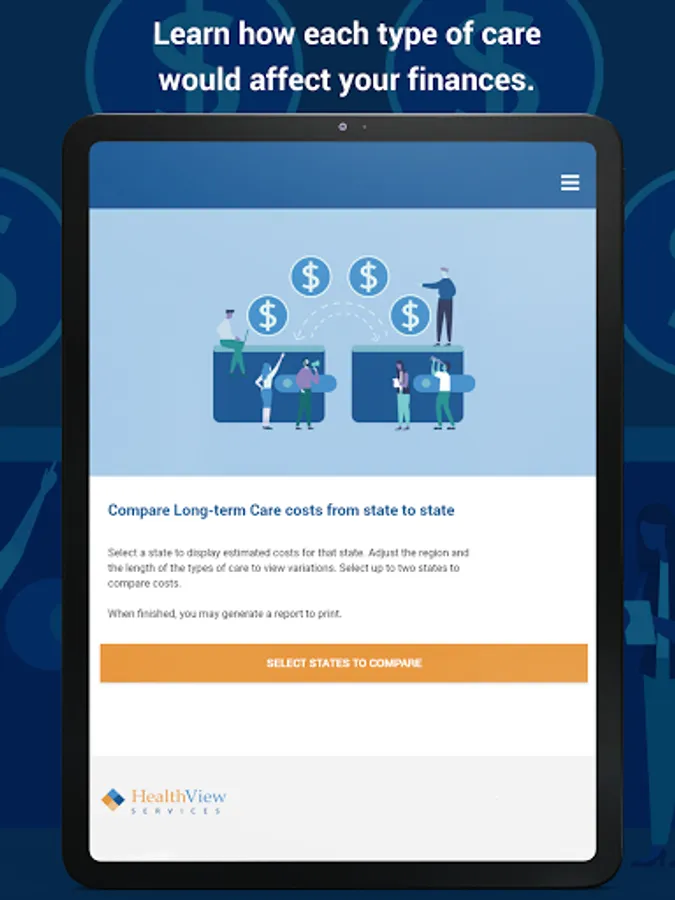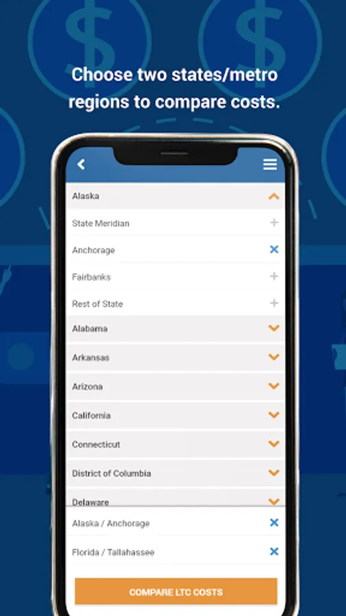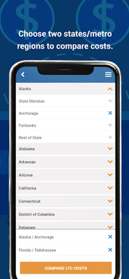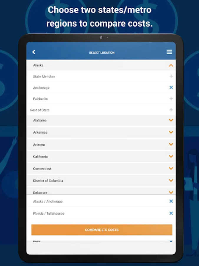 Compare long-term care costs from state-to-state. Select a state to display estimated costs for that state. Adjust the metro region, timing of care, and LTC care type to view different projections. Select up to two locations to compare costs. When finished, you may generate a PDF report with your results.