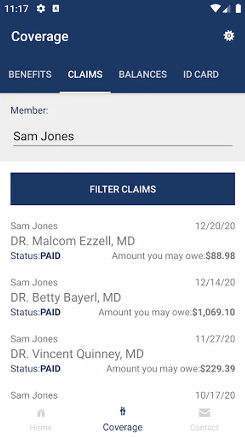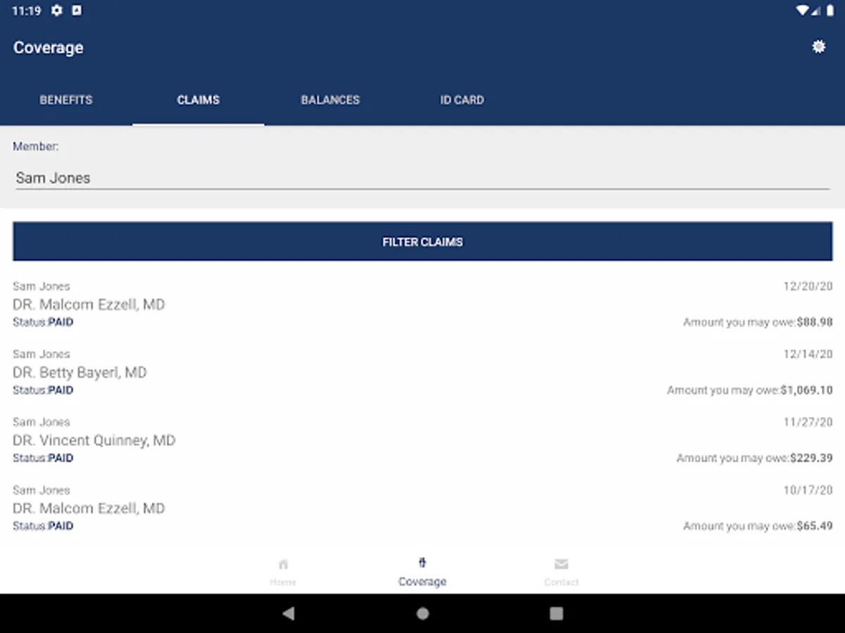 See your ten most recent claims. Get a detailed view of each one. Or look up specific medical, dental, vision, hearing claims by member name.
